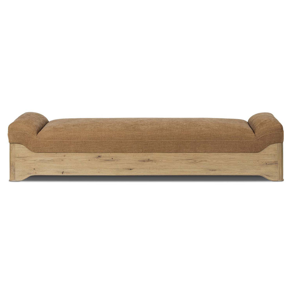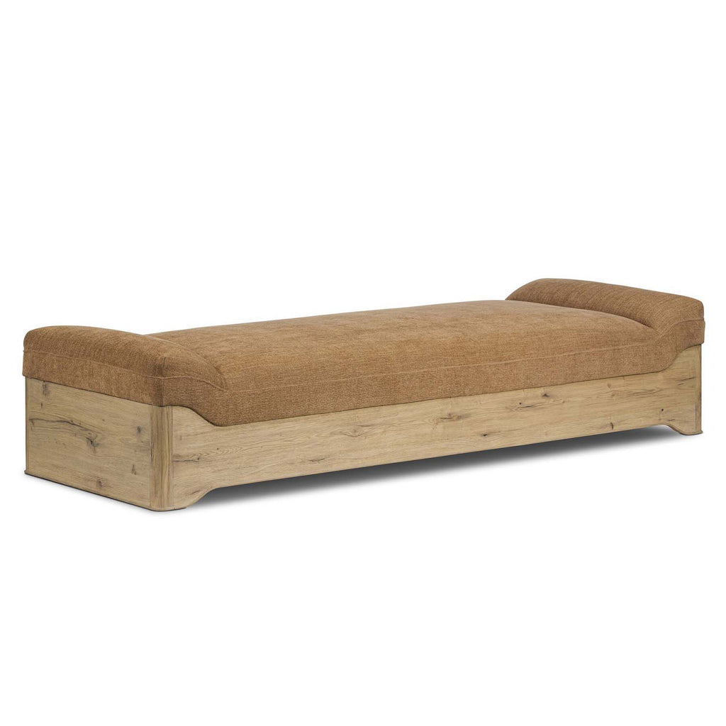 This statement-making chaise takes on an oversized shape-based silhouette, with a deep, chenille-upholstered seat and thick wood base. The subtly angled seating doubles as head support for a refined look, perfect as room dividing piece.