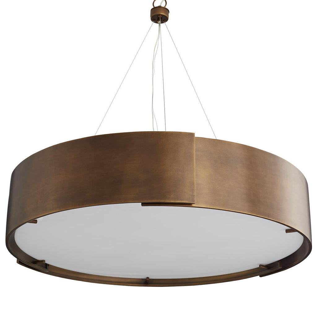 An effortless feat in our Dante chandelier—suspended pendant with overlapping antique brass bands and a frosted acrylic diffuser toning down the glow of five hidden lights. Additional chain available (CHN-129); damp-rated and suitable for covered outdoor use—finish will vary.
