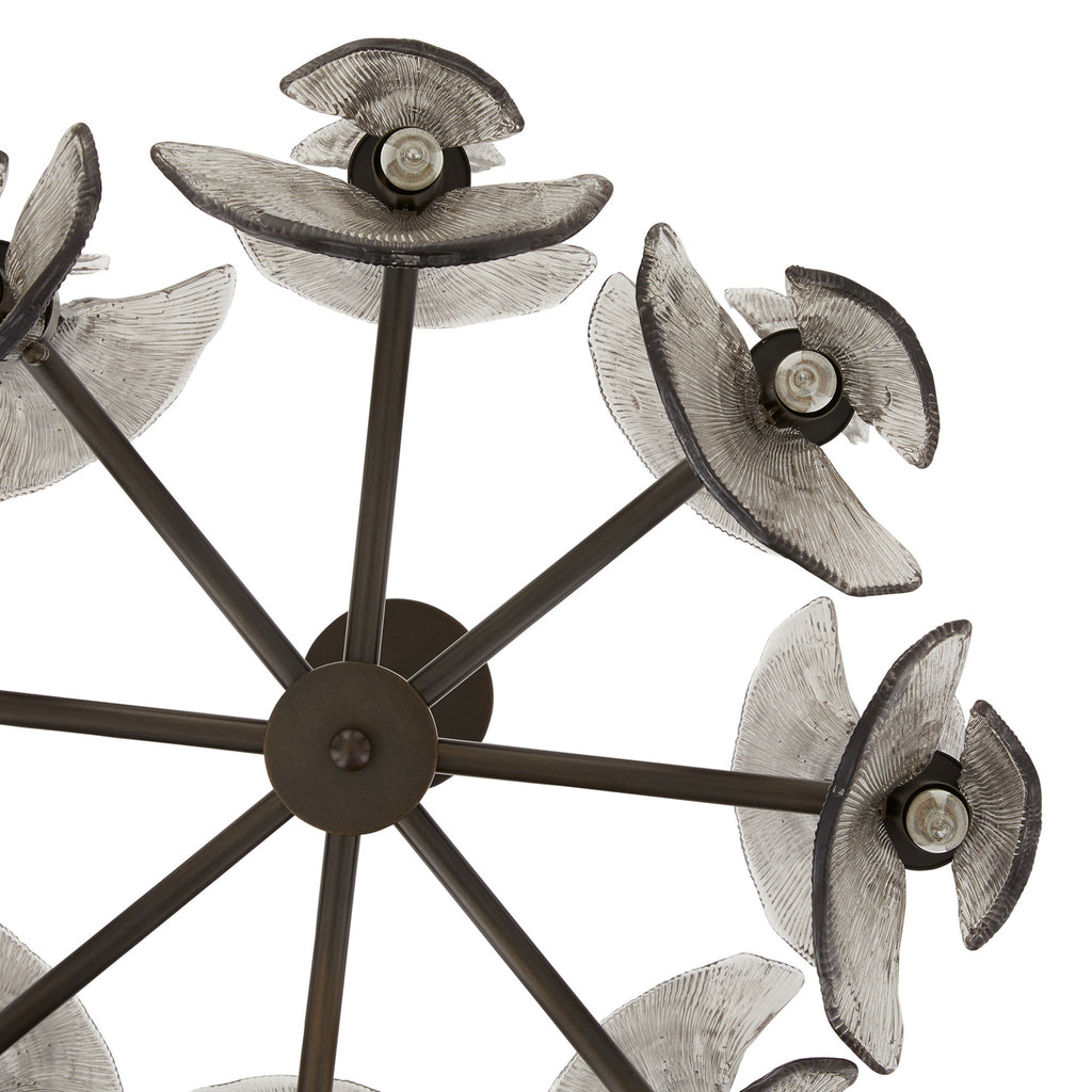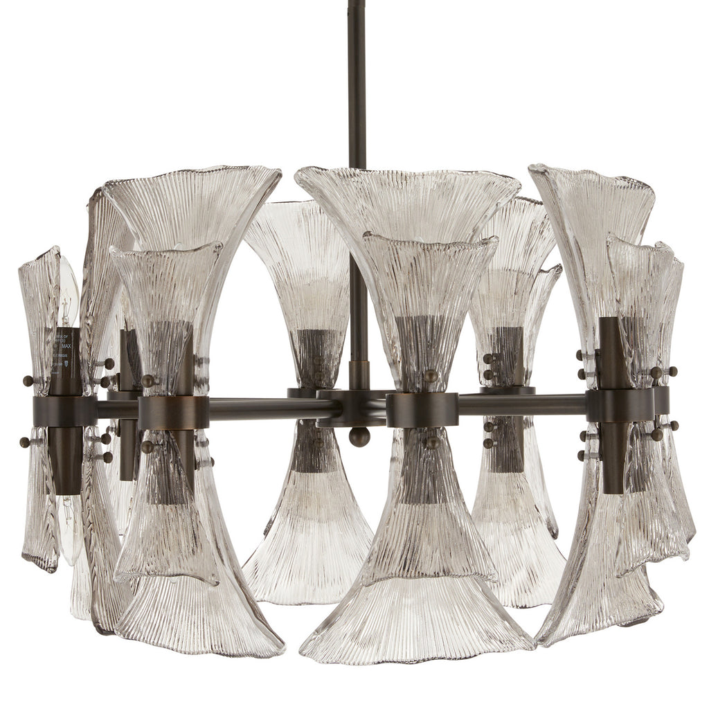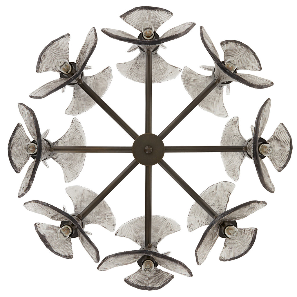 Art Nouveau jewelry’s sinuous lines and natural motifs inform our smoke glass chandelier. Textured like ginkgo leaves, double glass shades blossom in a concentric circle from an English bronze-plated steel frame. Suspended from a coordinating pipe and canopy, it’s a spectacular statement over a table. Damp-rated; finish will vary.
