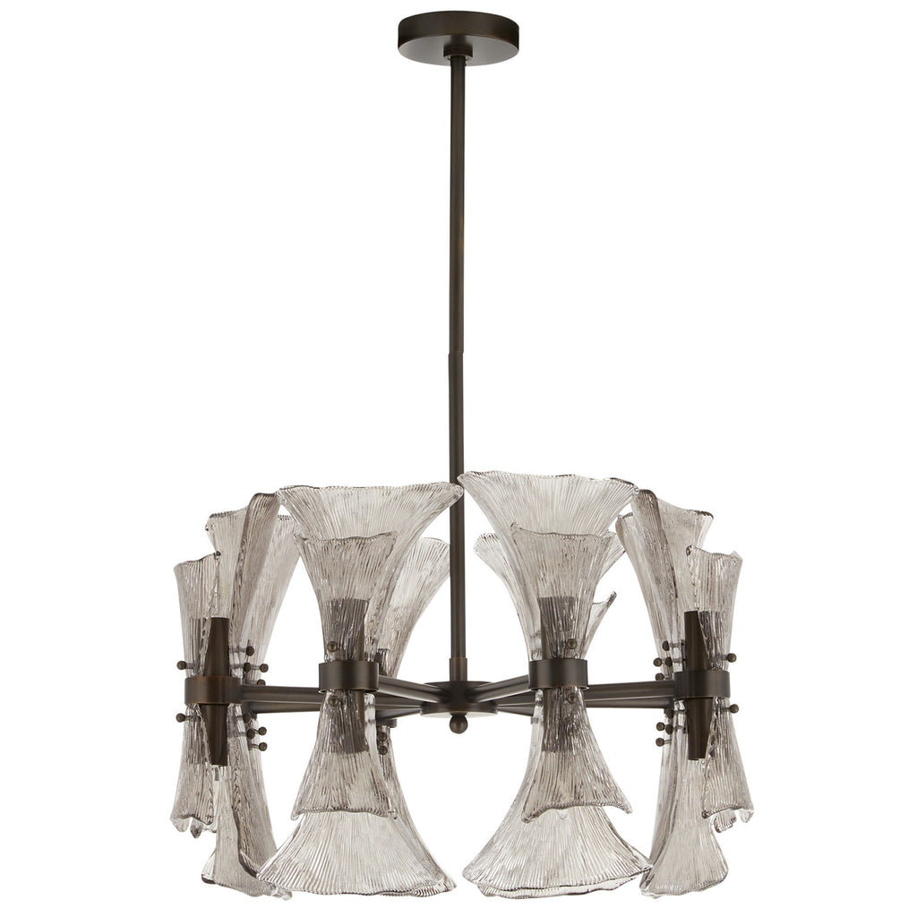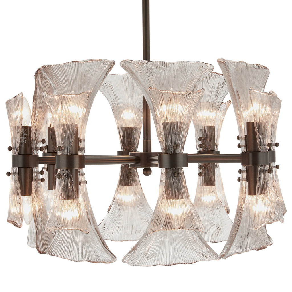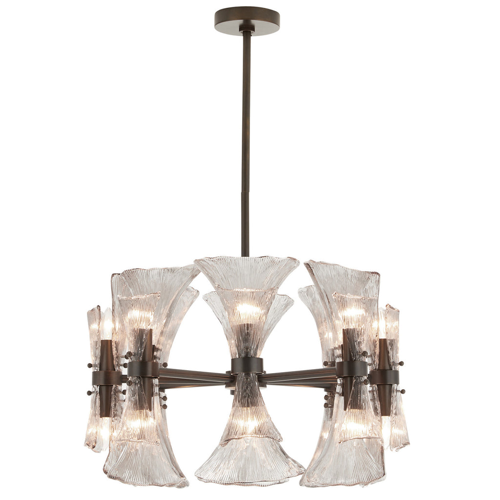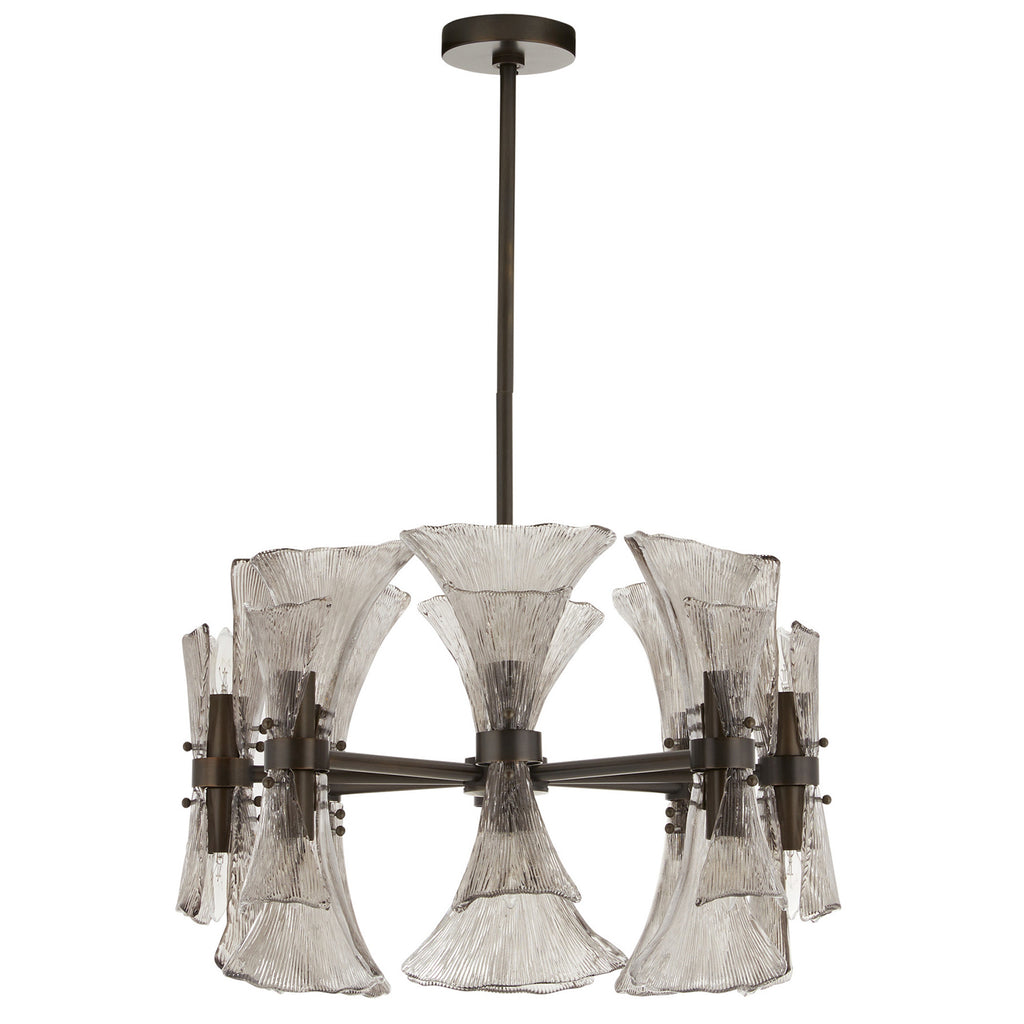 Art Nouveau jewelry’s sinuous lines and natural motifs inform our smoke glass chandelier. Textured like ginkgo leaves, double glass shades blossom in a concentric circle from an English bronze-plated steel frame. Suspended from a coordinating pipe and canopy, it’s a spectacular statement over a table. Damp-rated; finish will vary.
