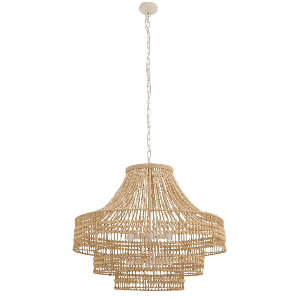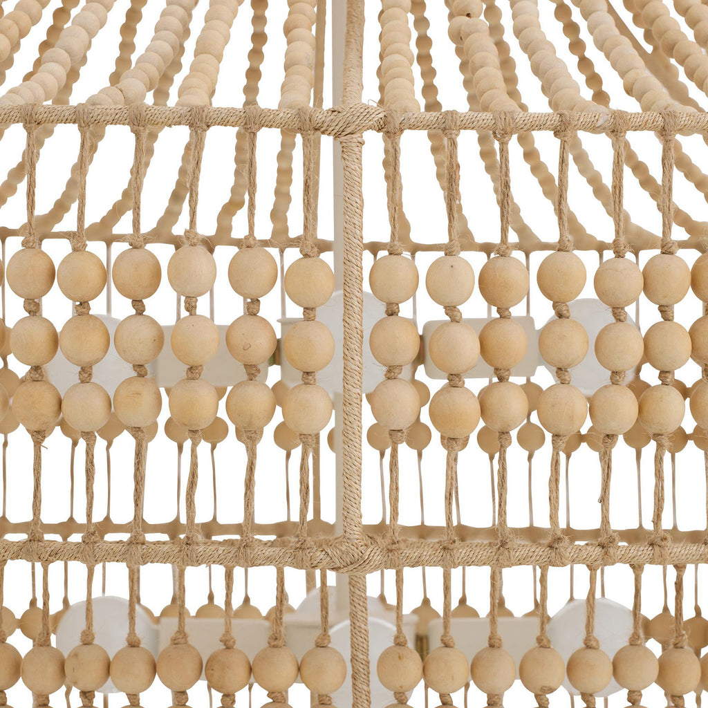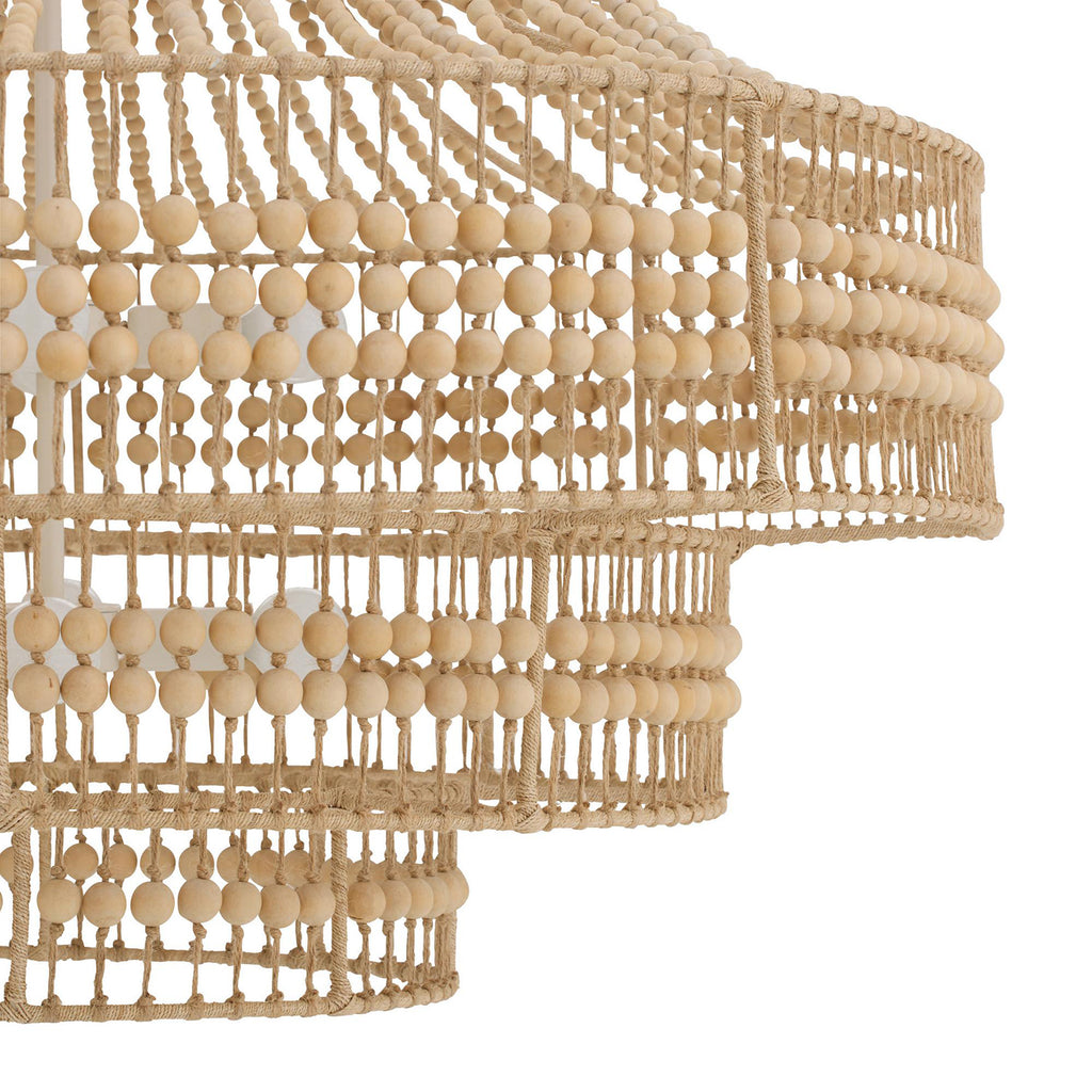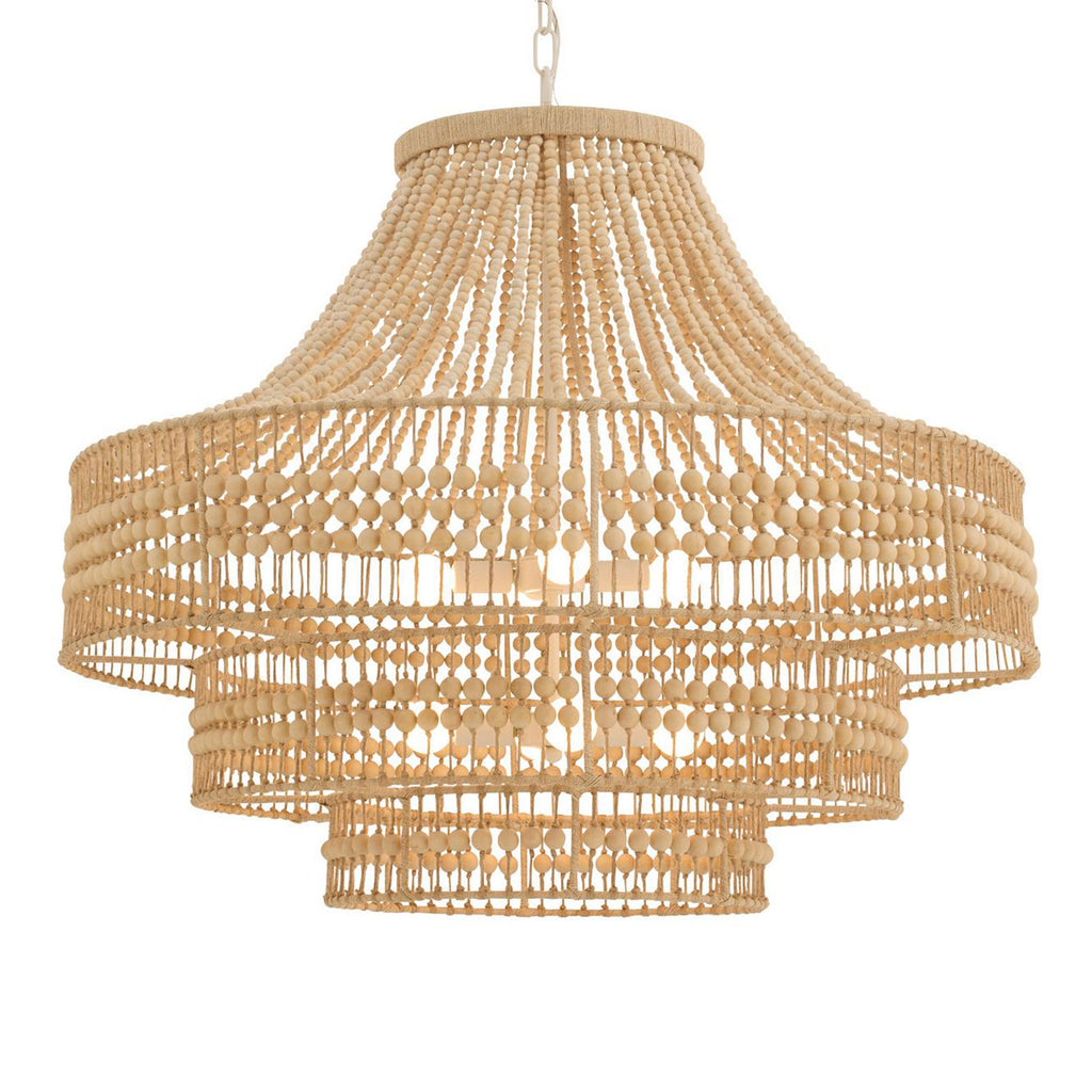 A rustic empire-style chandelier with tiered, hand-cut wooden beads strung over an abaca-wrapped frame in an airy, feminine form. Light cascades gracefully down each layer; additional chain available (CHN-204). Finish will vary.