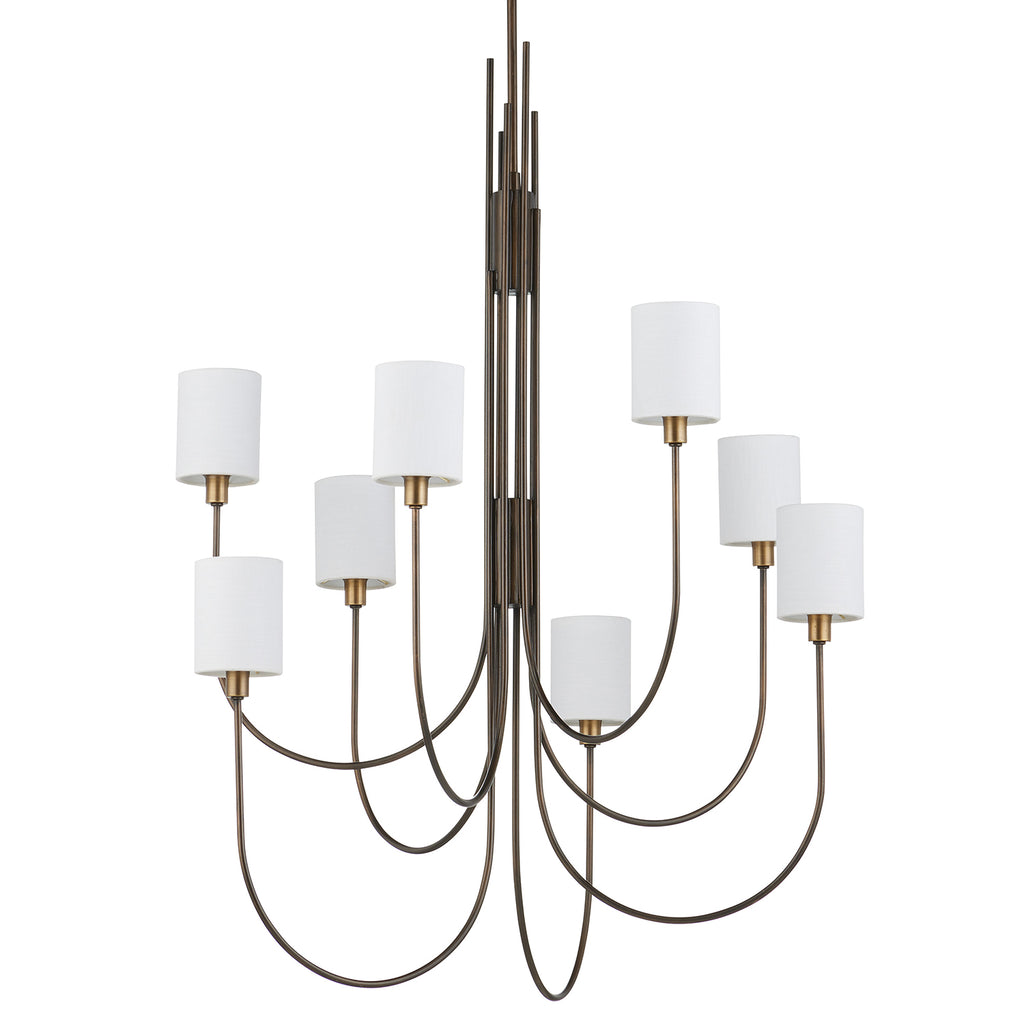 The Currey & Co Archetype Chandelier has a beautifully arcing form. The design details that make it special include the staggered curving lines of the thin pieces of metal at the bottom and the graduating placement of the straight ends as they attach to the stem. The Statuary Bronze finish is also a sophisticated design detail, as is the fact that the bobeches are finished in brass. The off-white linen shades sit directly on the bobeches and create a lovely glow.
