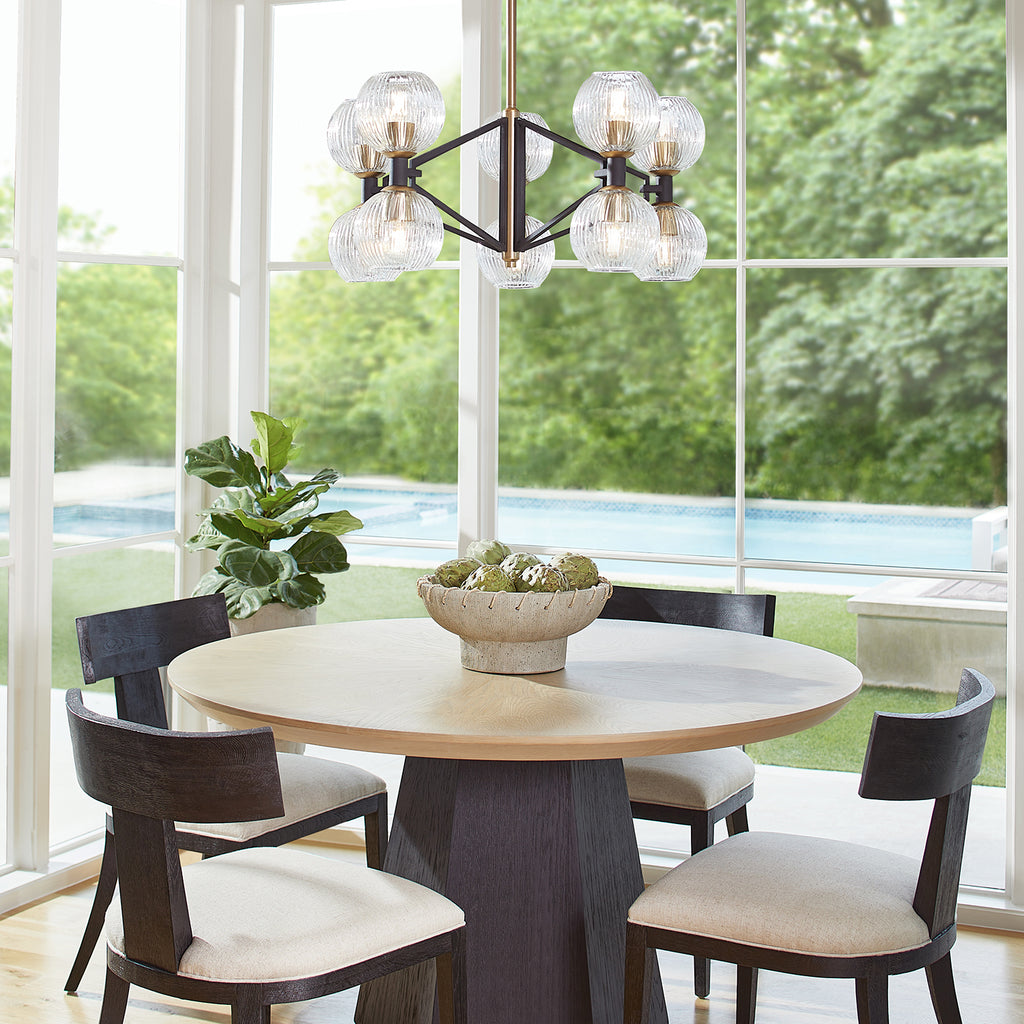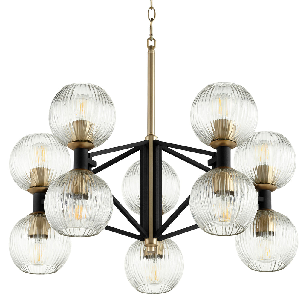 Luxurious and stunning, the modern Helios chandelier is characterized by its perfectly angled, noir frame and dual, up-light/down-light sockets. With bulbs neatly housed in aged brass, ribbed glass orb shades for an added touch of whimsy. The overall composition is futuristic and leans mid-century modern in its styling. This striking luminary comes together harmoniously in its eye-catching geometry and luxury appeal. Hang it over any dining room table, in any entryway foyer, or living room space as a captivating and functional centerpiece.