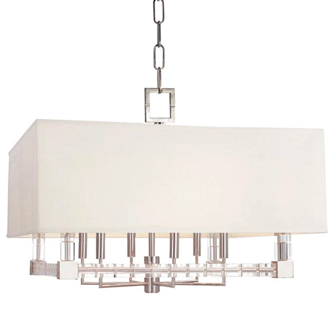 Renowned for built-to-last quality with a timeless feel, Hudson Valley offers a modern lighting collection with elegant touches, recalling vintage inspiration. Marked by symmetry and high-drama to marvel at from below, Hudson Valley Lighting chandeliers illuminate your living or dining room with inviting warmth. The Hudson Valley Alpine 6-Light chandelier with shade's unexpected impact comes from its futuristic materials and shapes and its icy crystal cubes, stacked along the metal frame. Subtly staggered clusters of candelabra lamps cast a sparkling glow along this prismatic frame, playing a brilliant light pattern across any room. Polished Nickel preserves the fixture’s winter chill while Aged Brass accents add warming contrast.