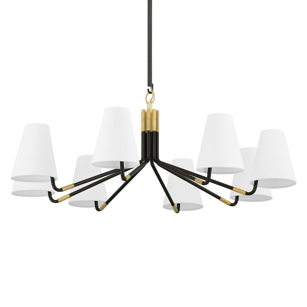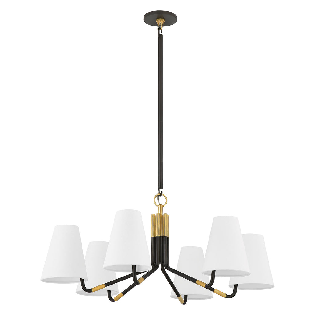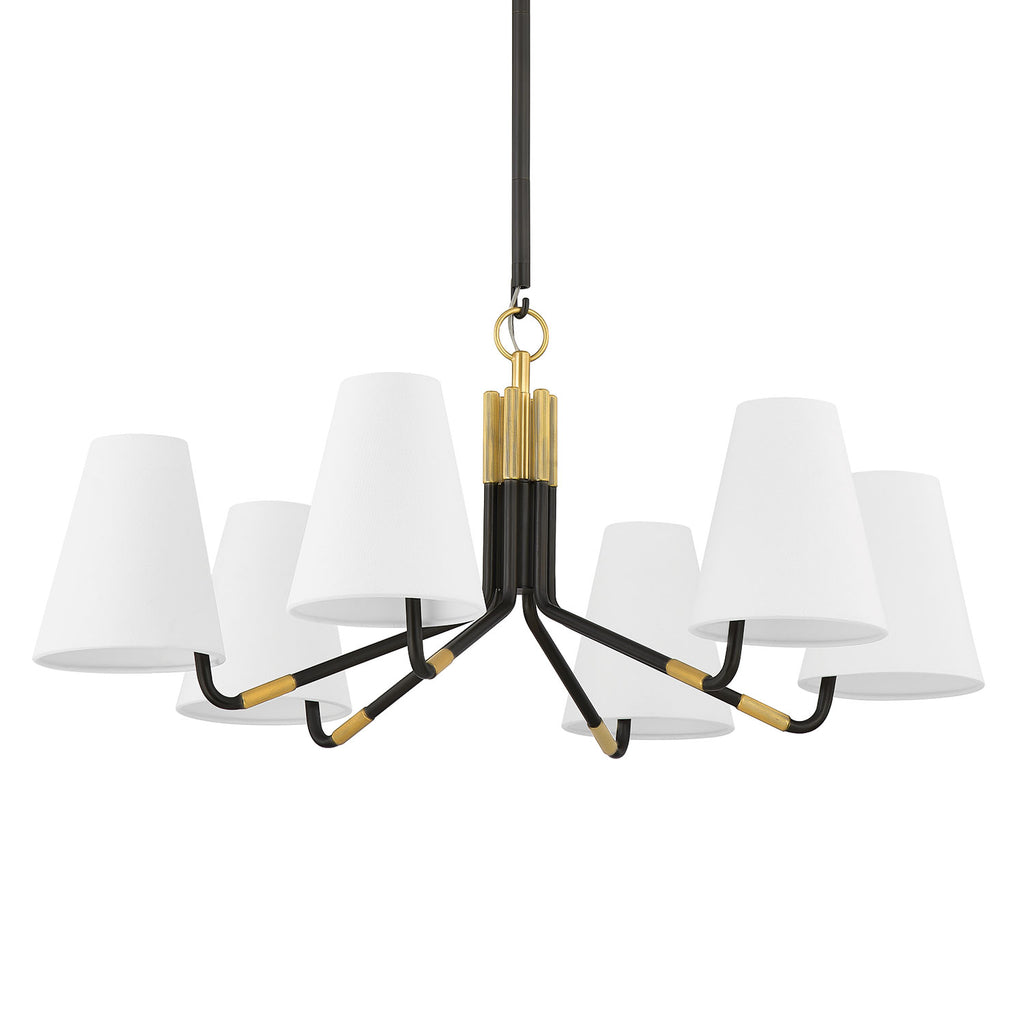 Renowned for built-to-last quality with a timeless feel, Hudson Valley offers a modern lighting collection with elegant touches, recalling vintage inspiration. Marked by symmetry and high-drama to marvel at from below, Hudson Valley Lighting chandeliers illuminate your living or dining room with inviting warmth. Inspired by a chandelier from the 1930s, the Hudson Valley Stanwyck wall sconce and chandelier take traditional elements, like the arm shape and tapered shades, and updates them with a fresh material combination and machined details. Slender Distressed Bronze arms, accented with Aged Brass caps and knurled bands, swing up at the end to hold white linen shades. The chandelier has a beautiful hook-and-ring detail and the shades are mounted off-center, adding more visual interest to this modern design.