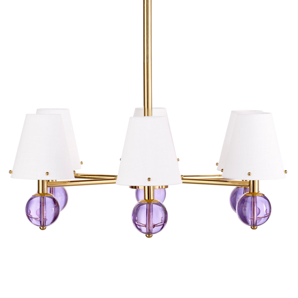 The ultimate jewel for your ceiling—six luminous, gem-toned crystal balls on warm brass framework, each topped with a brass ball trimmed lined shade. Our Belvedere Six-Light Chandelier is a glamorous go-to for glowing up your dining space or a luxe touch in your living room.