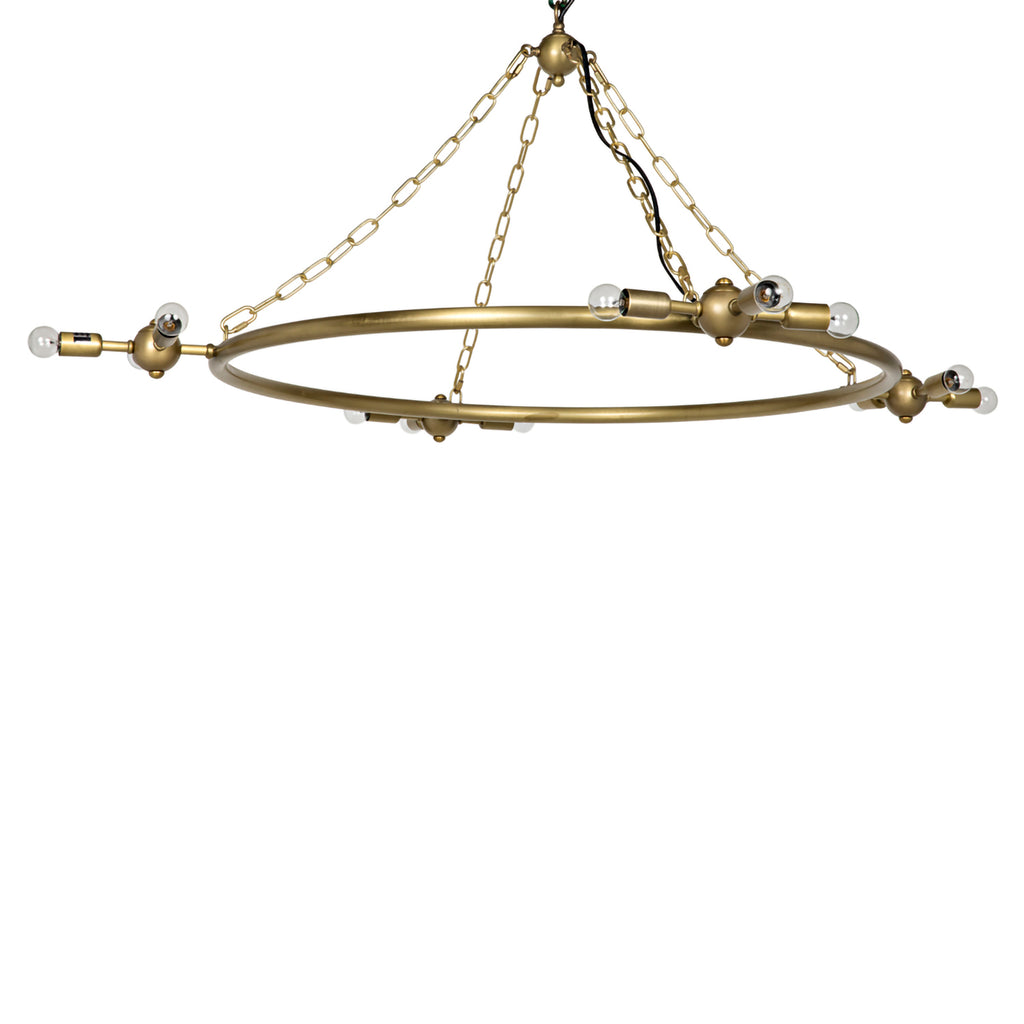 An antique brass metal ring is adorned with twelve 15W bulbs in this sleek pendant lamp. Geometric and spare during the day, when lit it provides a soft warm glow.