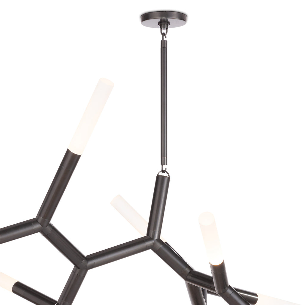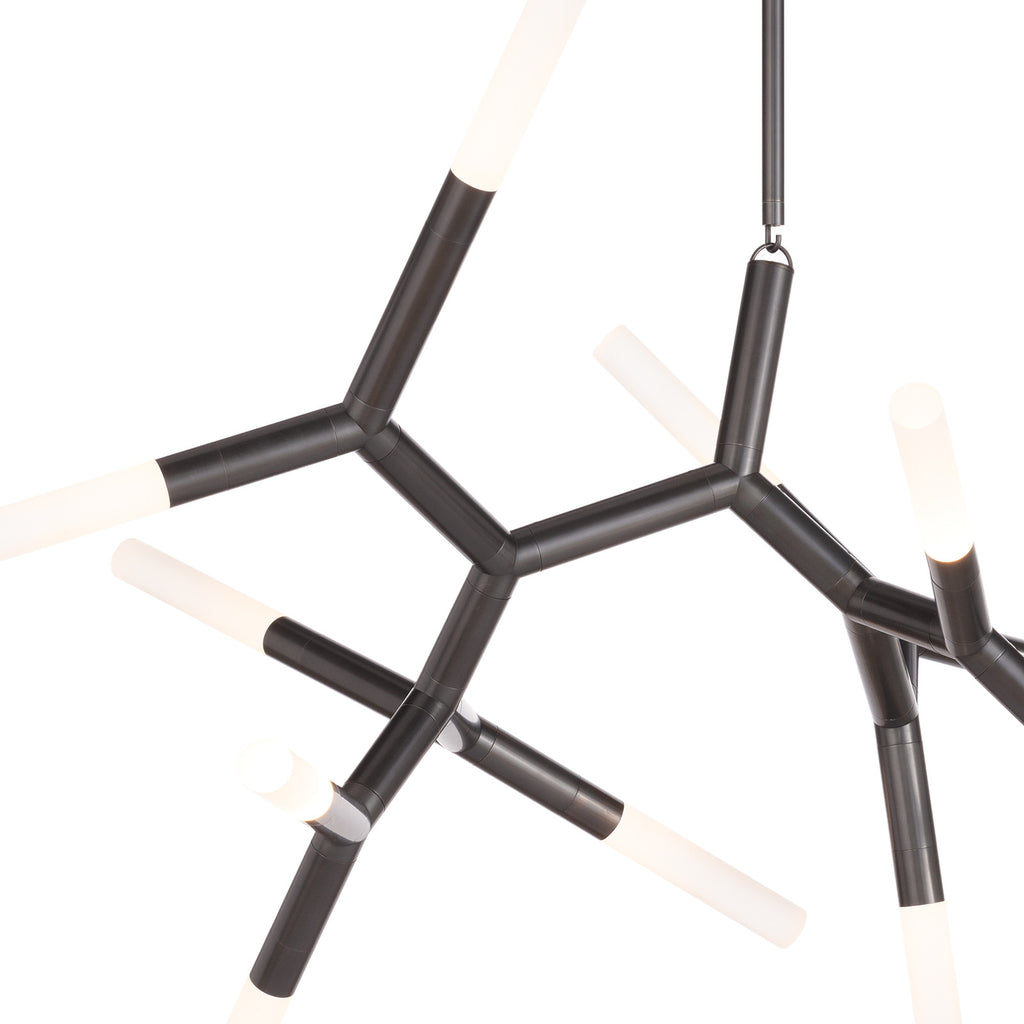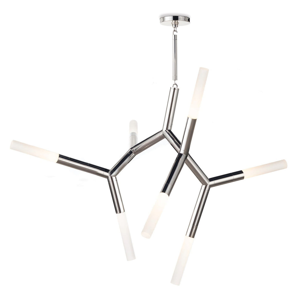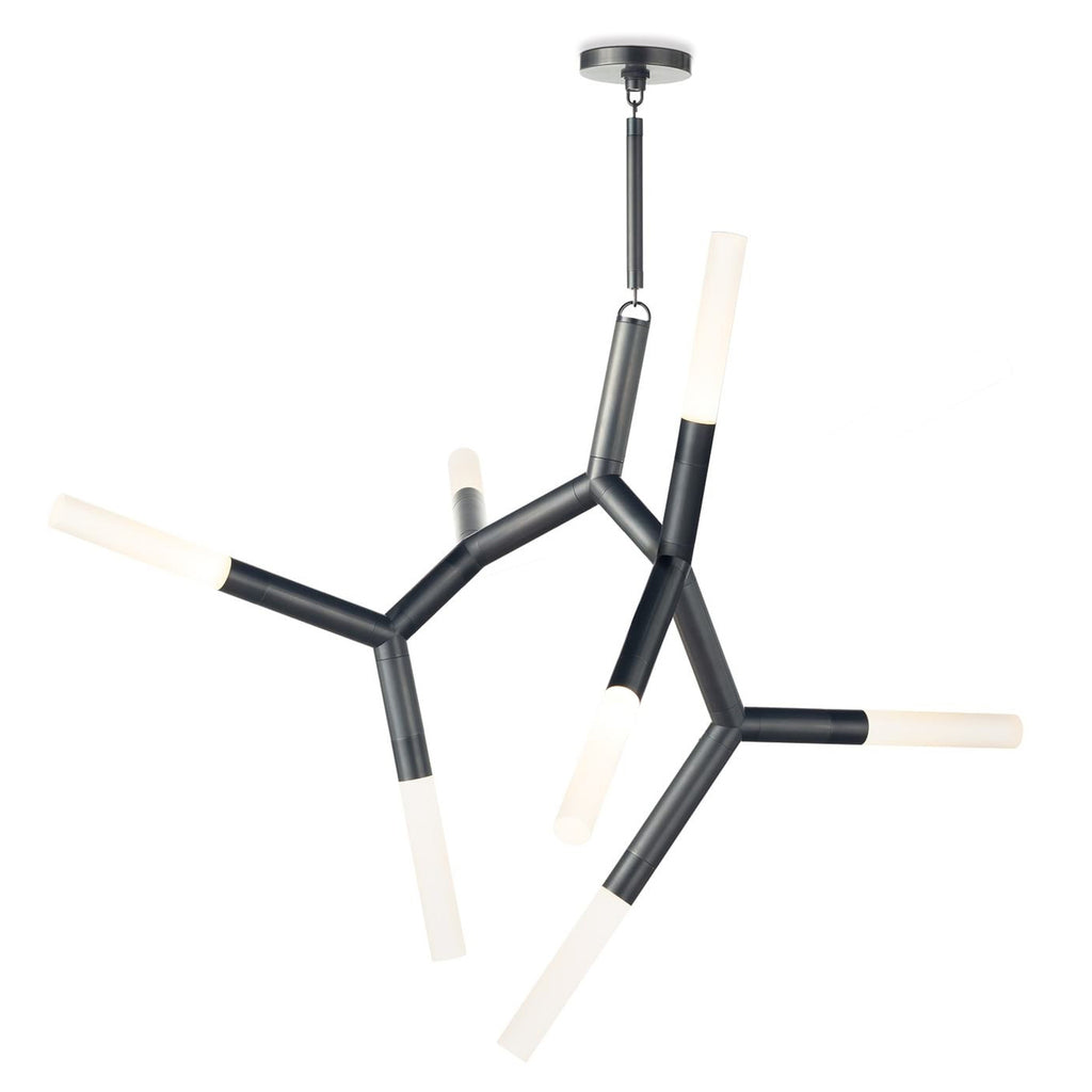 Our Traveler Chandelier is the epitome of modern dynamism with its multiple, branching end points finished in custom frosted acrylic bulb covers. Expertly engineered to hang at a slight angle, place this sculptural wonder over a table, in an office or entryway for a modern lighting statement piece.
