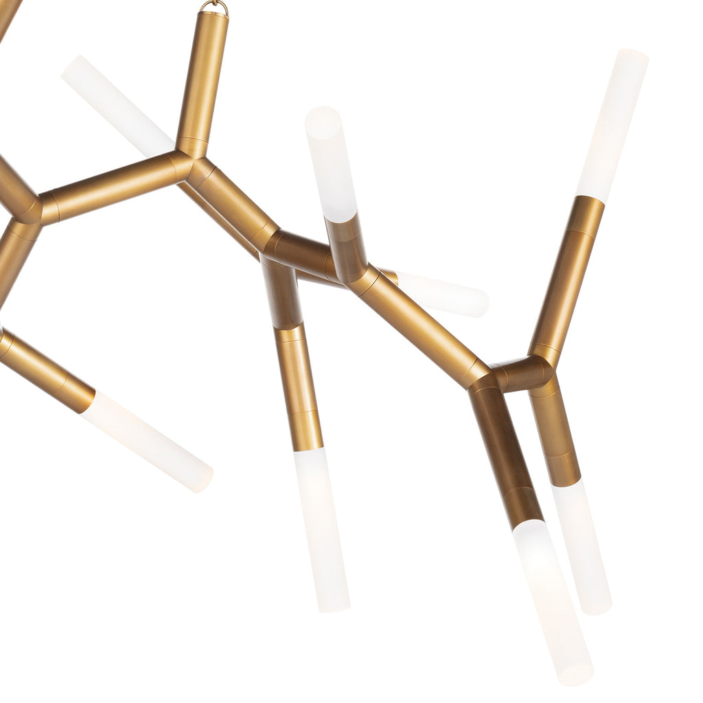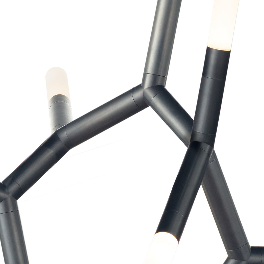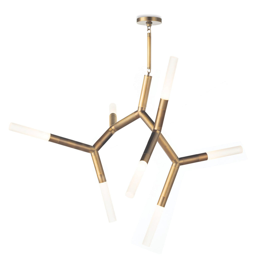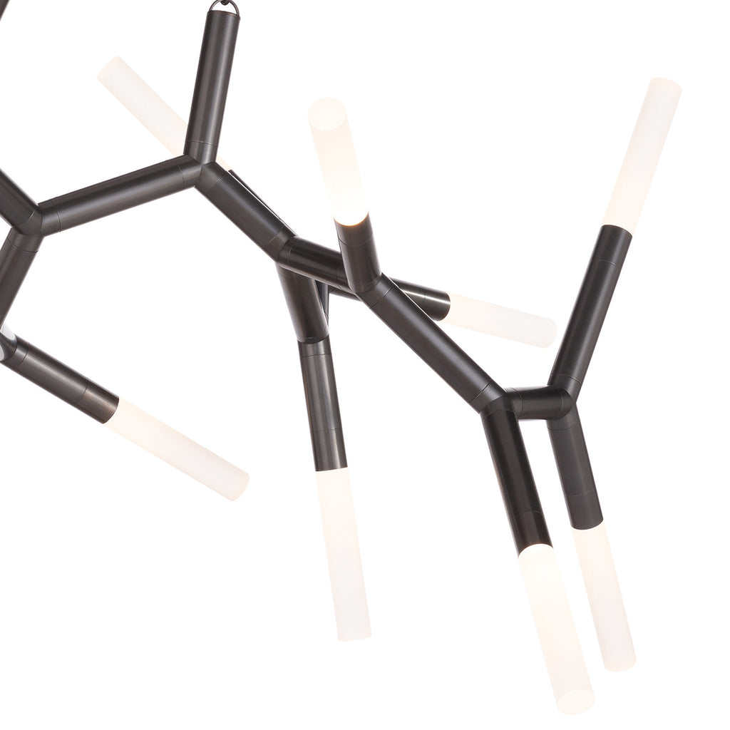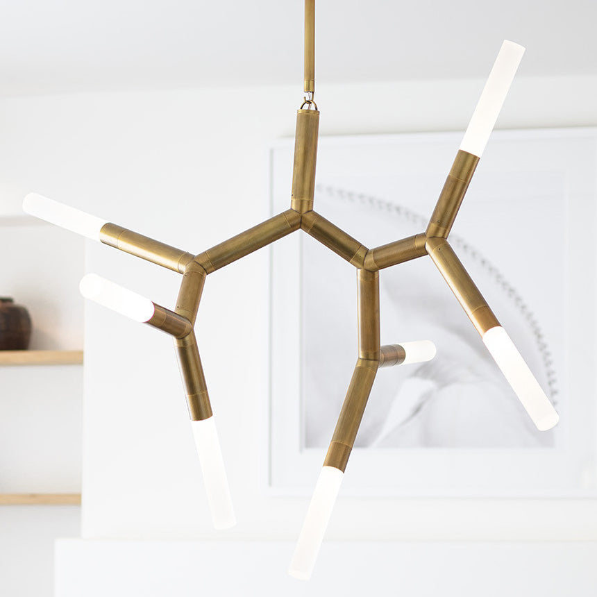 Our Traveler Chandelier is the epitome of modern dynamism with its multiple, branching end points finished in custom frosted acrylic bulb covers. Expertly engineered to hang at a slight angle, place this sculptural wonder over a table, in an office or entryway for a modern lighting statement piece.