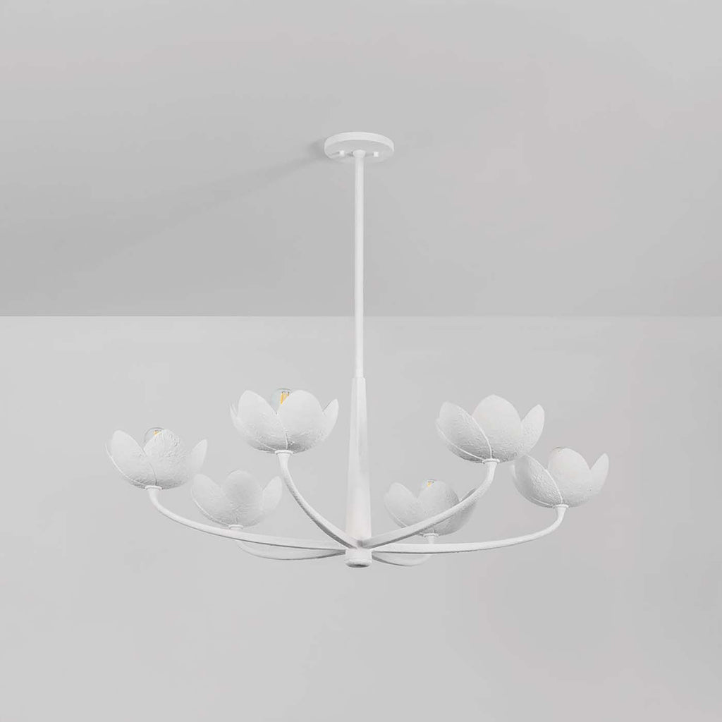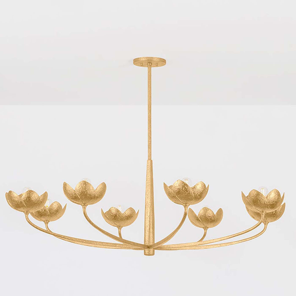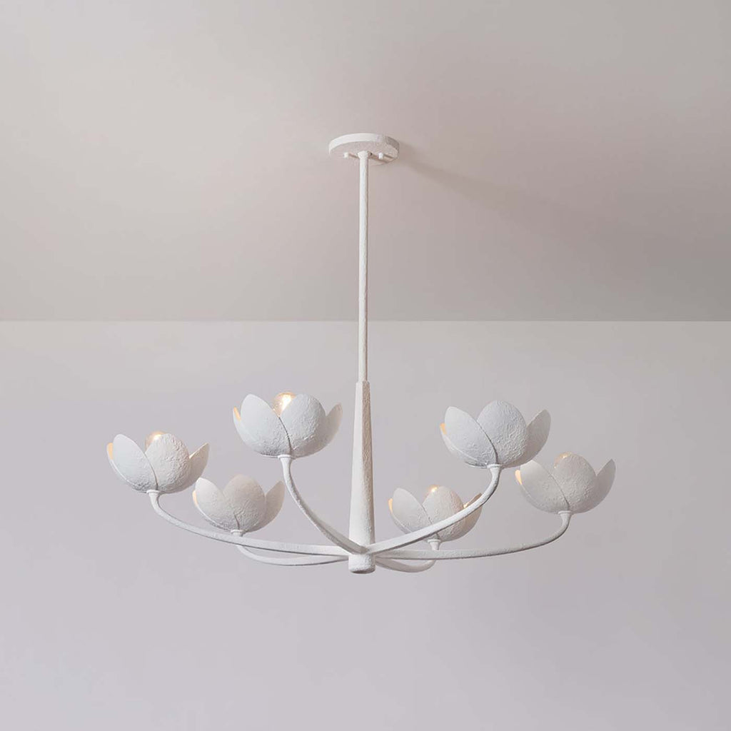 A fresh take on a botanic motif, the Arcata family features sculptural, romantic silhouettes with highly tactile, hand-worked finishes. The gentle sweeping arms transition from square to round, creating a dynamic look that complements the floral forms. Arcata is available as a 1-light sconce and 6 or 8-light chandeliers with the choice between contemporary Gesso White or a luxurious Vintage Gold Leaf finish.