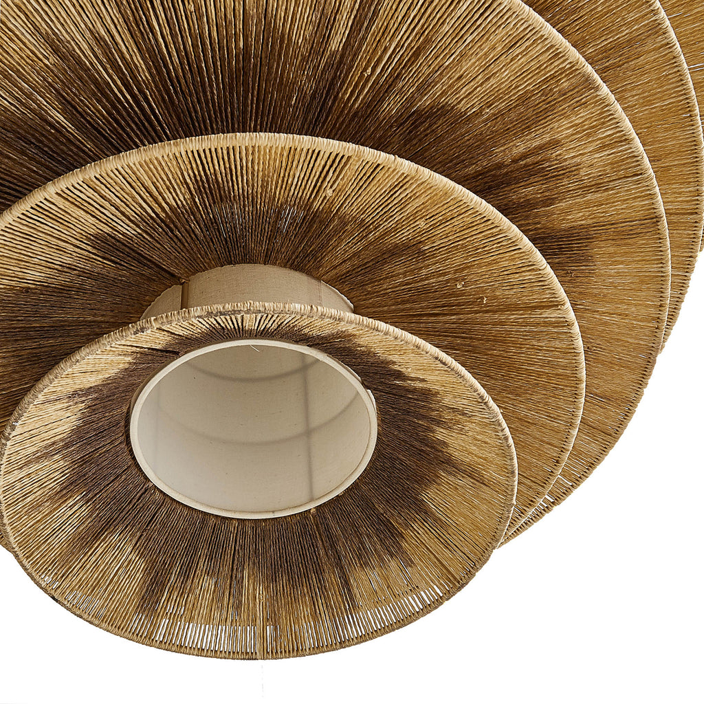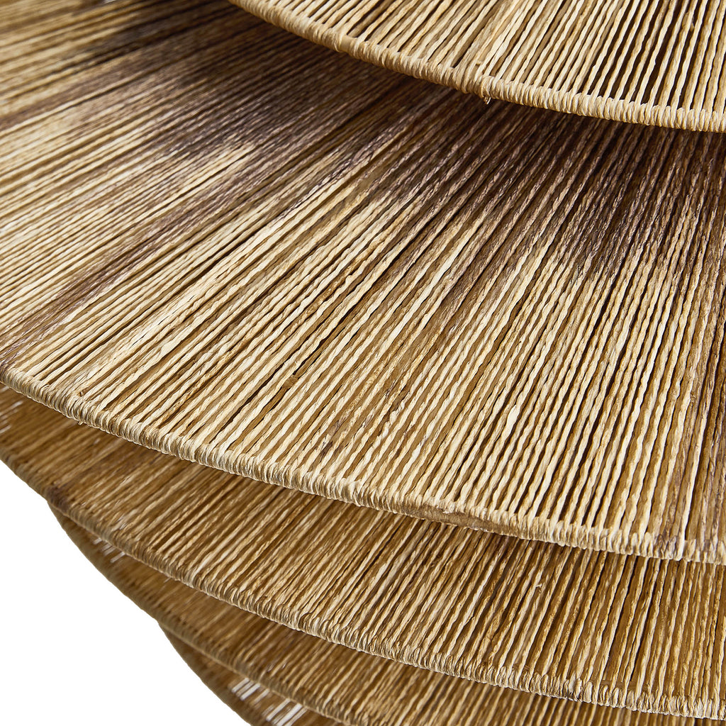 Just like the layered scales of a pinecone, shallow cones of natural and tobacco-stained raffia are layered in gradations of shade to dramatic effect. This sustainable fixture hangs from an antiqued brass finished support, with a lantern-style cotton under-shade providing a soft glow. Finish will vary.
