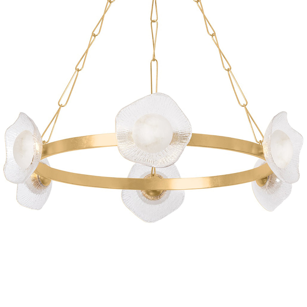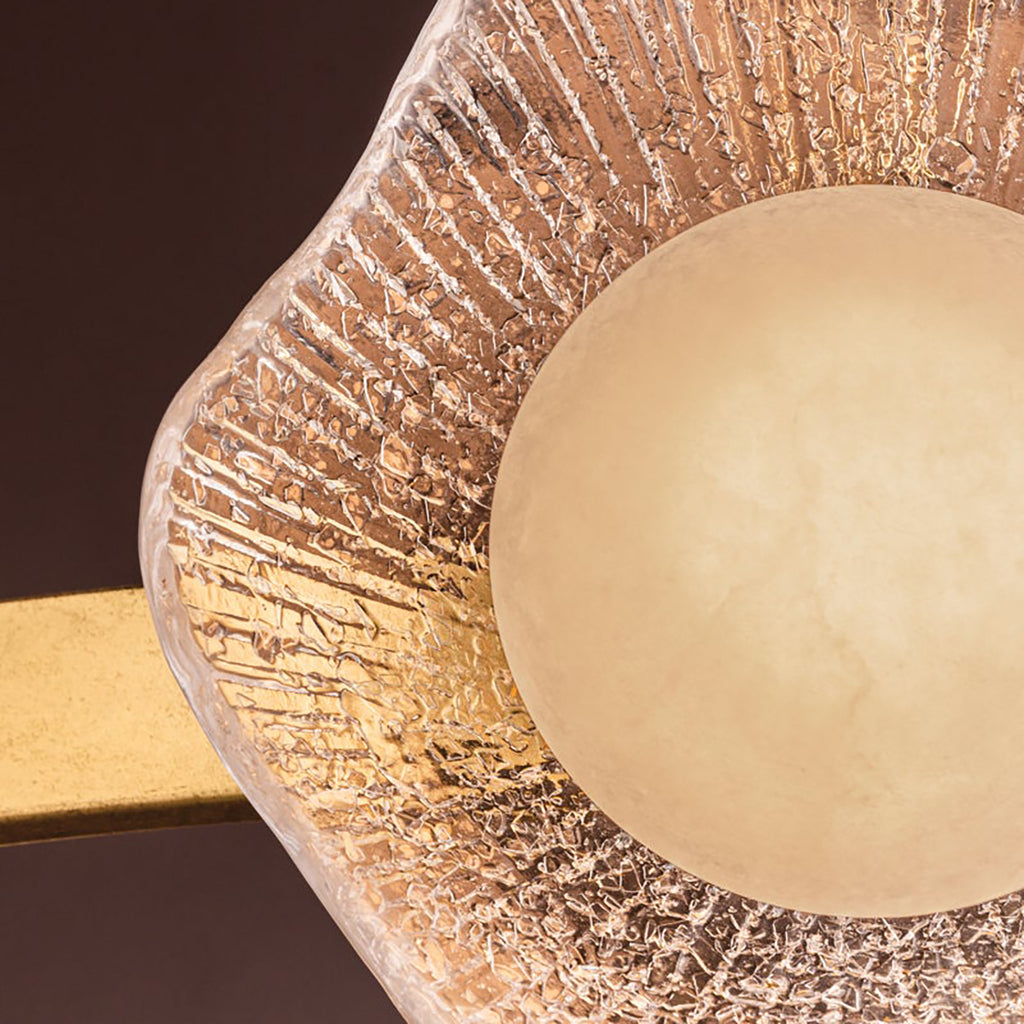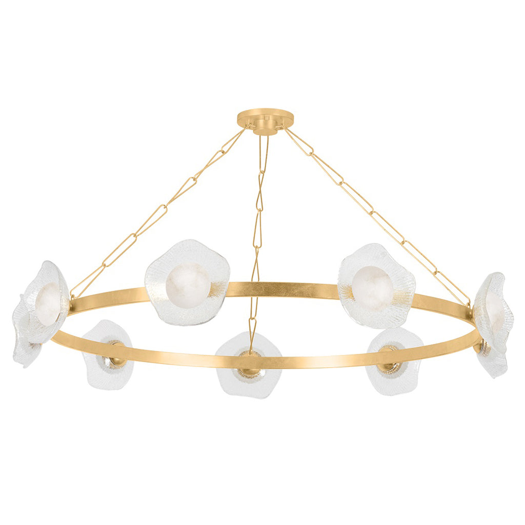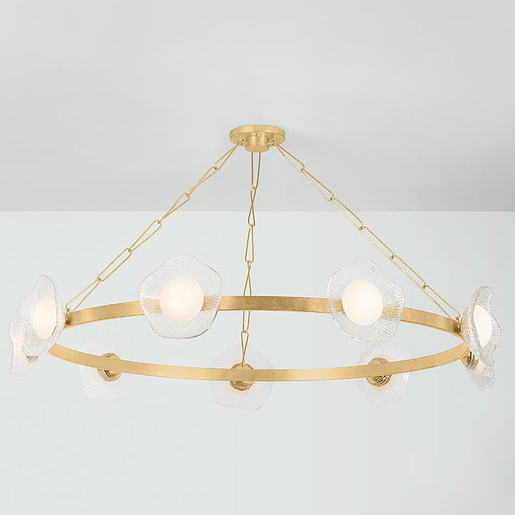 Combining organic and modern elements, Corbett Lighting Almandine is an elevated take on a traditional ring chandelier. The minimalist frame is accented with floral-shaped shades hand-cut from fluted piastre glass. Finished in Vintage Gold Leaf, the restrained metalwork allows the beauty of the blooms to shine. Almandine is available as a single-tier chandelier with 6 or 9 lights, a double-tier chandelier with 15 lights, and a single-light wall sconce.