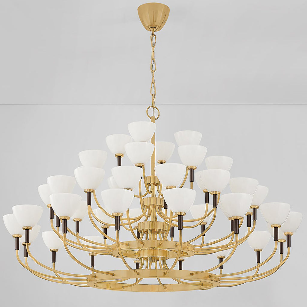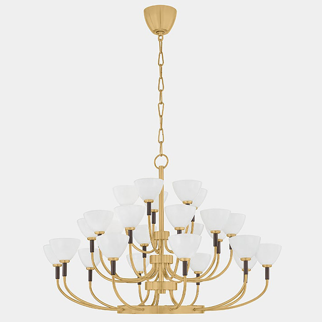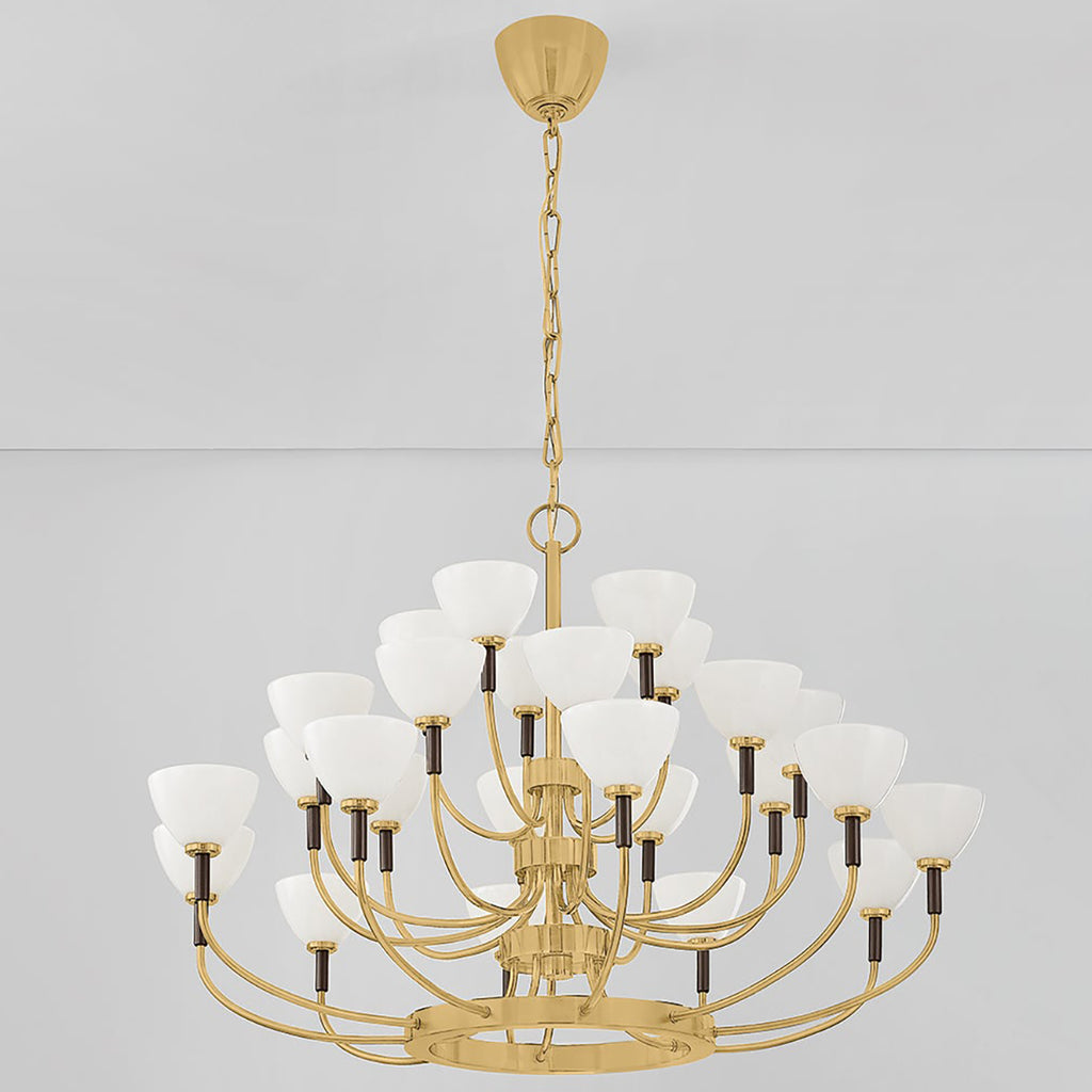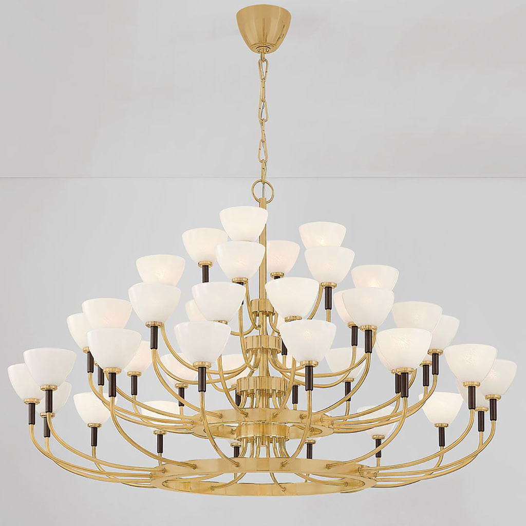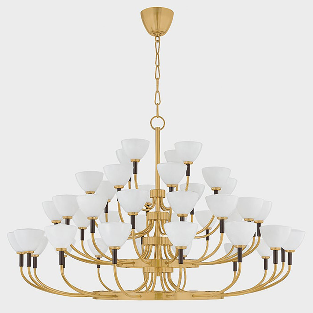 Modern with a historical reference, the Corbett Lighting Brahma family uses scale and repetition to create a stunning maximalist statement. The contrasts between the Vintage Brass and Bronze metalwork add visual interest, while the stacked tiers create a grand look. The central rings of the fixture support gracefully branching arms with milky cloud glass shades, contributing to the majestic presence of this chandelier. Whether you choose the 25 or 44 light option, Brahma makes an impressive addition to any space.