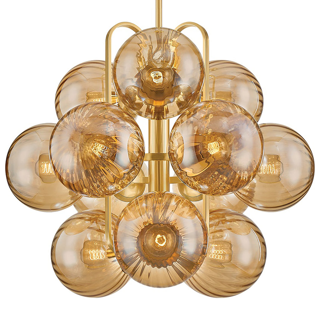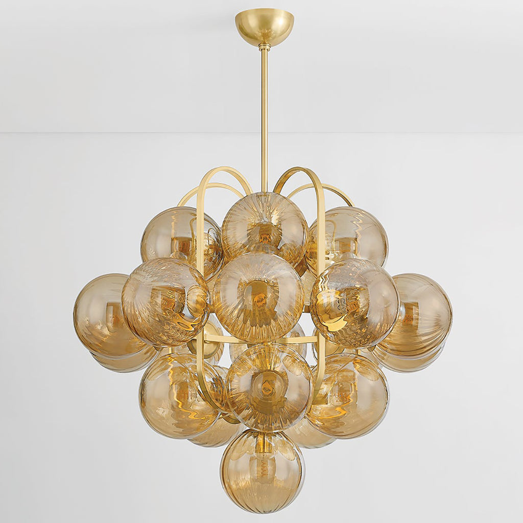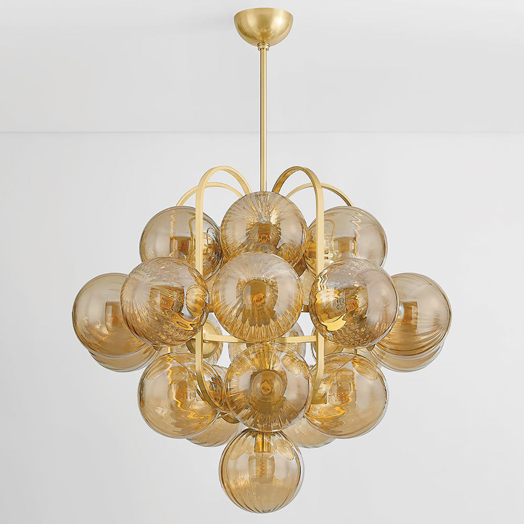 Like grapes on a vine, a cluster of glass orbs perch along the antique-inspired frame of Corbett Lighting Cronus. The ribbed, light bronze glass emits a warm glow, complemented by gleaming Vintage Polished Brass arches. Available as a 1-light wall sconce or 12 or 21-light chandelier, Cronus infuses a living or dining space with old Hollywood glamor.