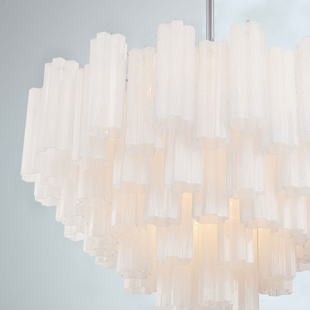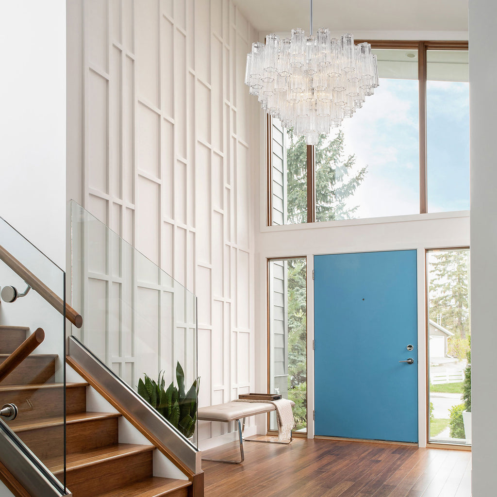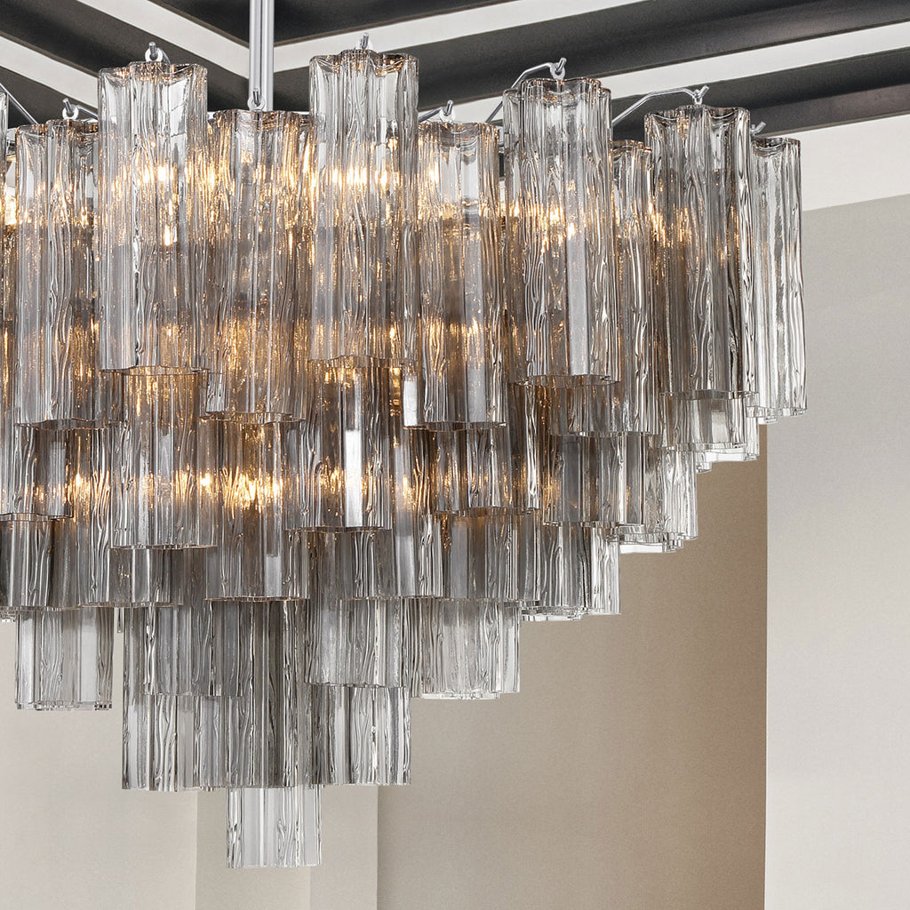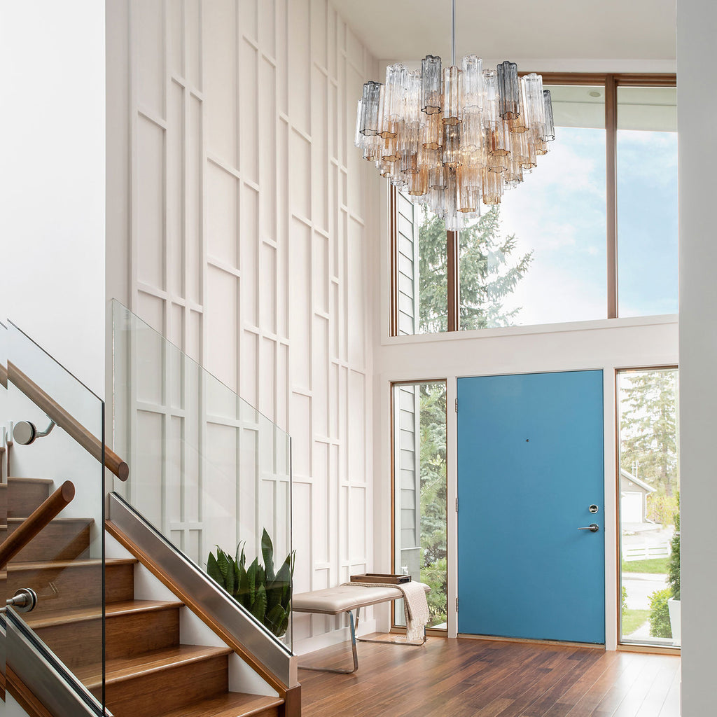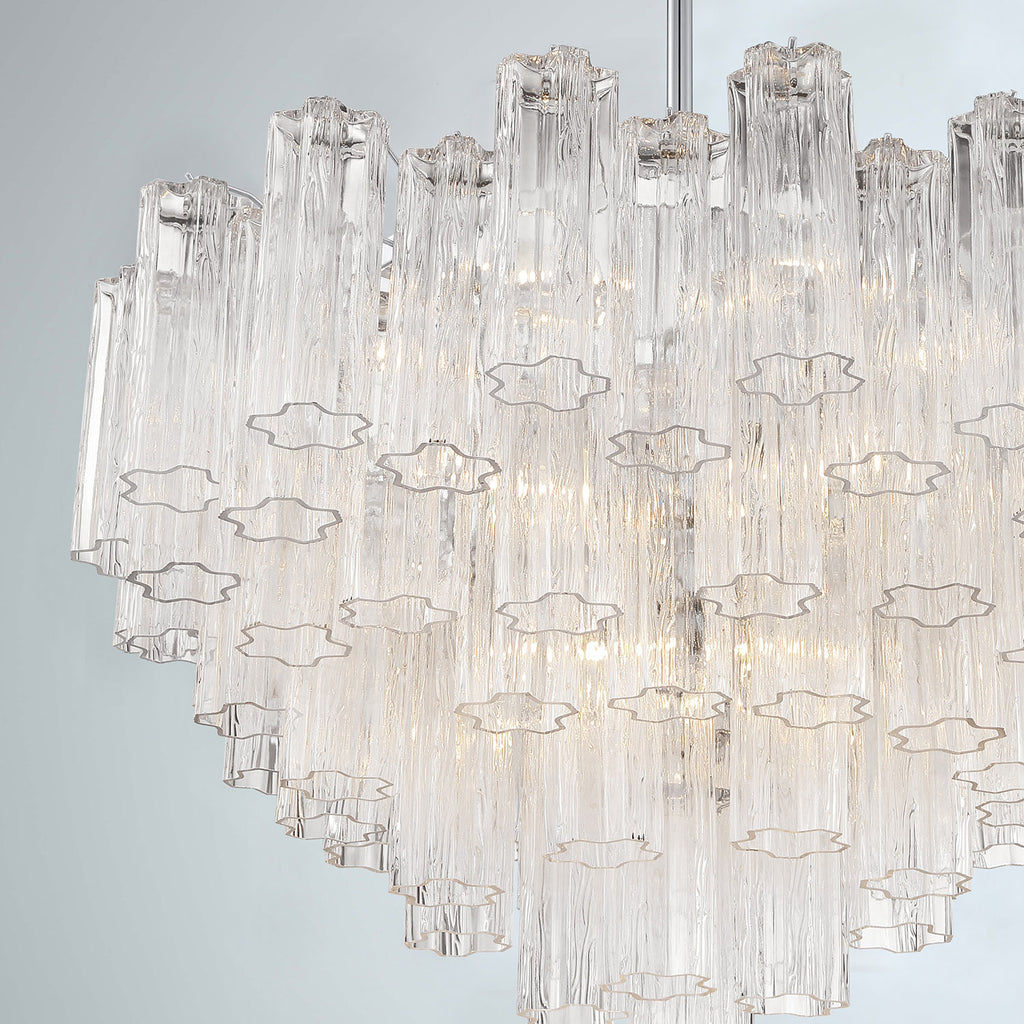 Crystorama is known for its standout lighting, which is exceptional in quality and design. From traditional all-crystal designs to transitional lighting collections, Crystorama offers styles that will match any décor and are always in fashion. The captivating Addis Lighting Collection is a modern-day interpretation of the iconic mid-century Tronchi chandelier. Inspired by its predecessor's sleek lines and geometric shapes, the Addis features a polished Chrome or Aged Brass metal frame that exudes sophistication and style. Its unique design showcases transparent tiers of textured Tronchi glass tubes, forming a mesmerizing 5-point rounded star shape. Choose from a range of glass colors, including clear, amber, smoke, and white, or the stunning Autumn option, which features a captivating multicolor disposition of amber, clear, and smoke Tronchi glass. The Addis Lighting Collection offers various sizes and finishes, allowing you to find the perfect fit for your space while adding a touch of timeless elegance. Addis collection features a versatile transitional design. A merging of design utilizing minimalist styling and clean lines that add visual appeal to a space. This multi tiered modern fixture gives maximum light output either as a chandelier or a ceiling mount. Polished Chrome has a silver finish with a cooler tone. It has a sleek mirror-like finish and fits most décor styles from vintage to deco and modern to contemporary.