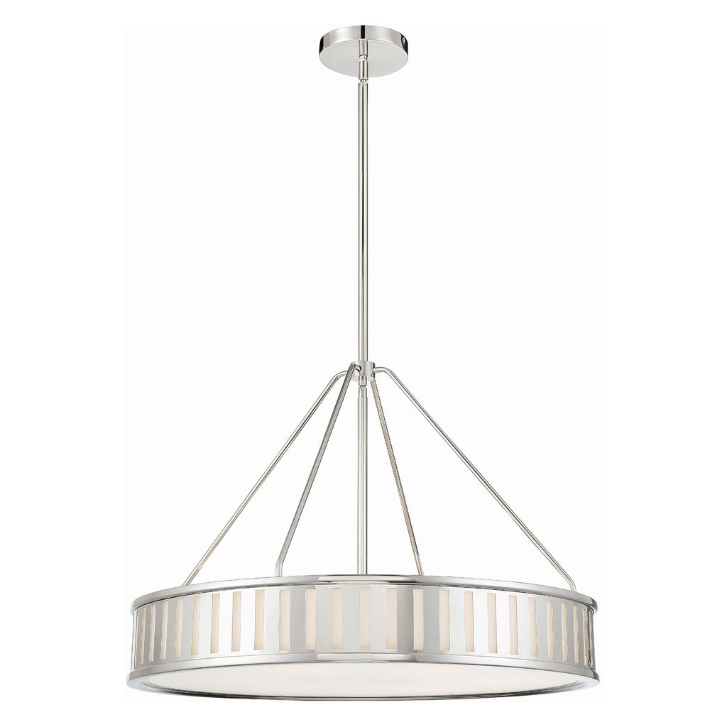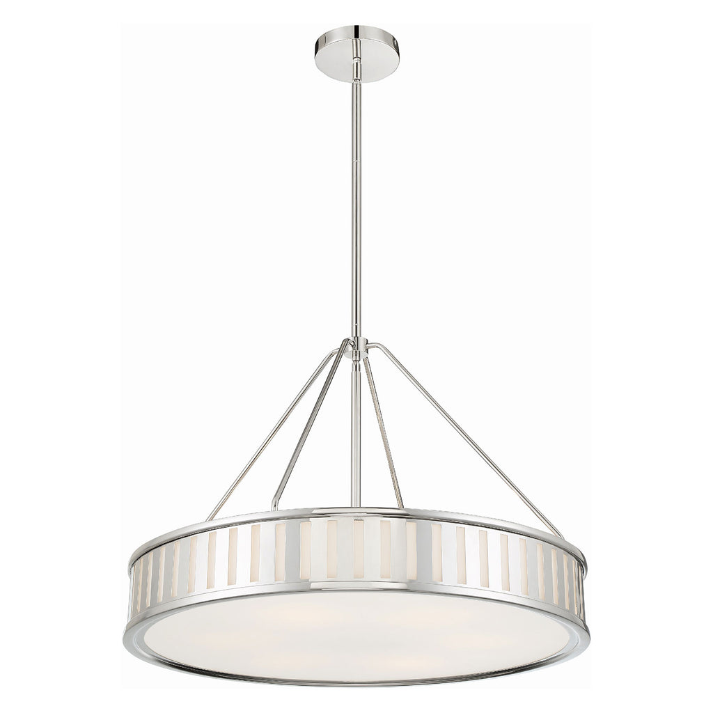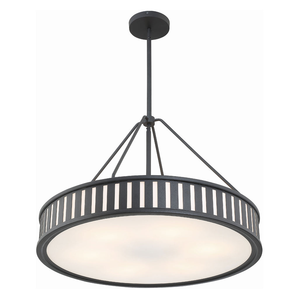 Crystorama is known for its standout lighting, which is exceptional in quality and design. From traditional all-crystal designs to transitional lighting collections, Crystorama offers styles that will match any décor and are always in fashion. The contemporary Kendal collection makes a statement with its graphic uniform pattern. Its metal frame surrounds white glass in this elegant drum-shaped pendant. The high contrast of Vibrant Gold, Black Forged, or Polished Nickel against white glass is a great way to add a touch of drama to a room. Kendal collection features a versatile modern / contemporary design. A merging of design utilizing minimalist styling and clean lines that add visual appeal to a space. The rectangle cutouts in the Kendal feature the illuminated white glass. Black Forged metal finish is a deep black finish with a surface texture. This finish is ideal for industrial, rustic, farmhouse, and transitional decor settings.