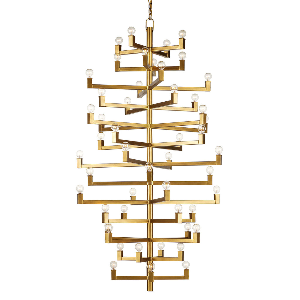 Clean articulated arms with resolute geometries make the big, bold Currey & Co Andre Medium Chandelier a powerful statement that can easily swing from contemporary to transitional styles, and many in between. Made of wrought iron in a brass finish, the gold chandelier will take on other personalities when the shapes of the bulbs are changed. Tall foyers and great rooms with high ceilings are perfect spots for this luminous modern light fixture with 28 lights.
