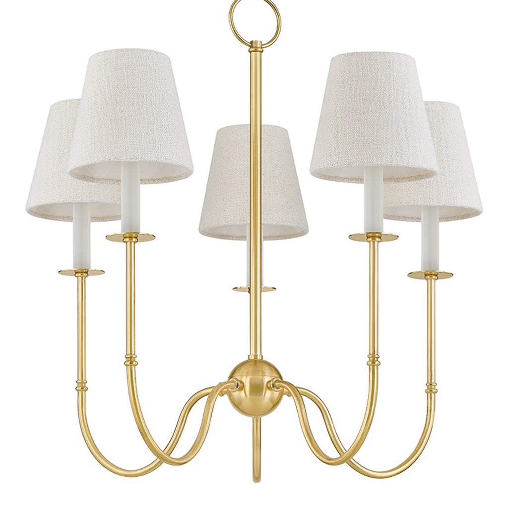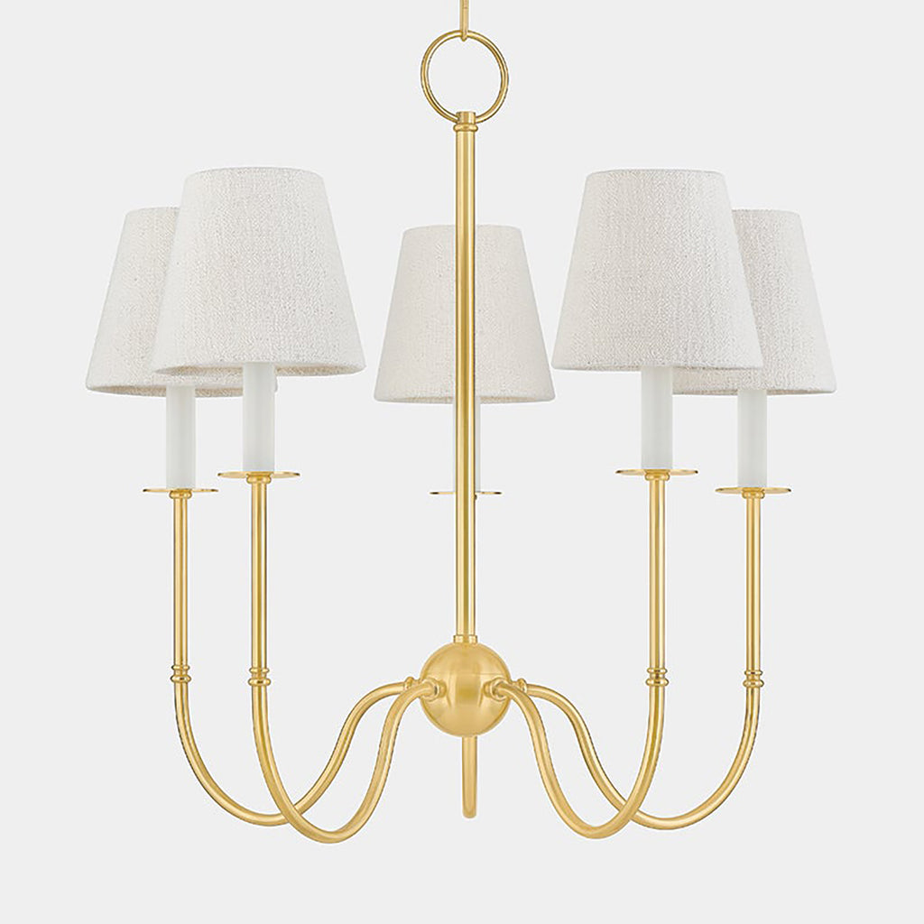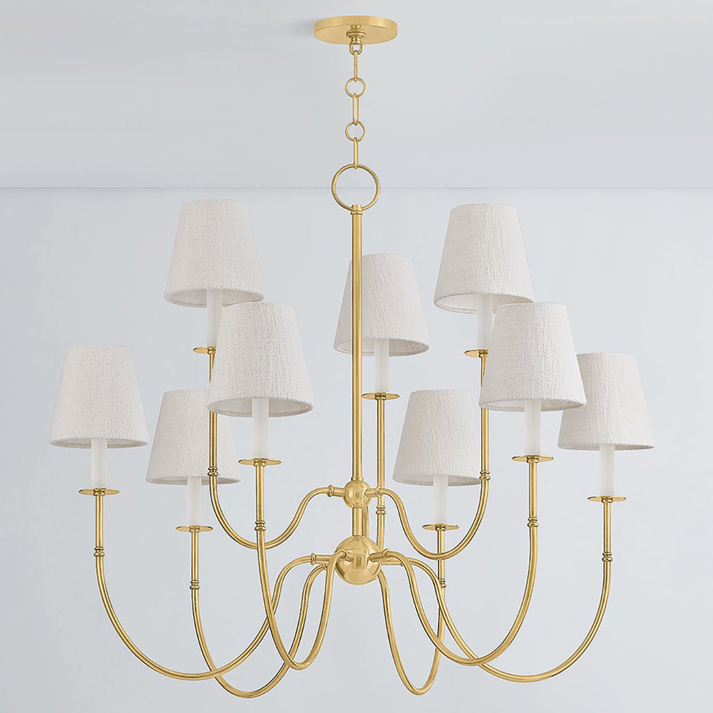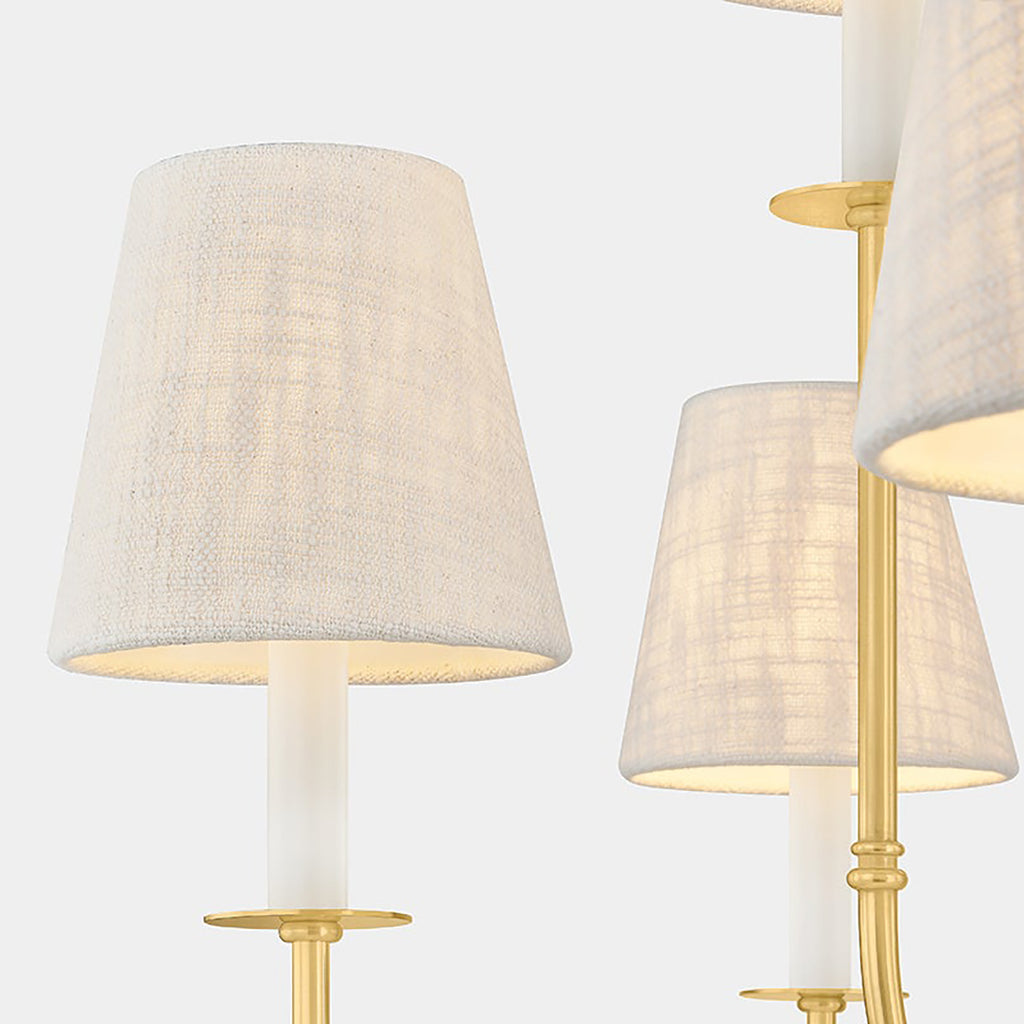 Vintage meets modern in the Hudson Valley Lighting Amina family. Traditional Victorian metalwork details, including wide bobeches, are paired with contemporary candle sleeves and short white linen shades. Finished in Aged Brass, the slender, elongated J-arms feature a dramatic swoop. Whether as a sconce or 5 or 9-light chandelier, Amina provides a fresh update to traditional forms.