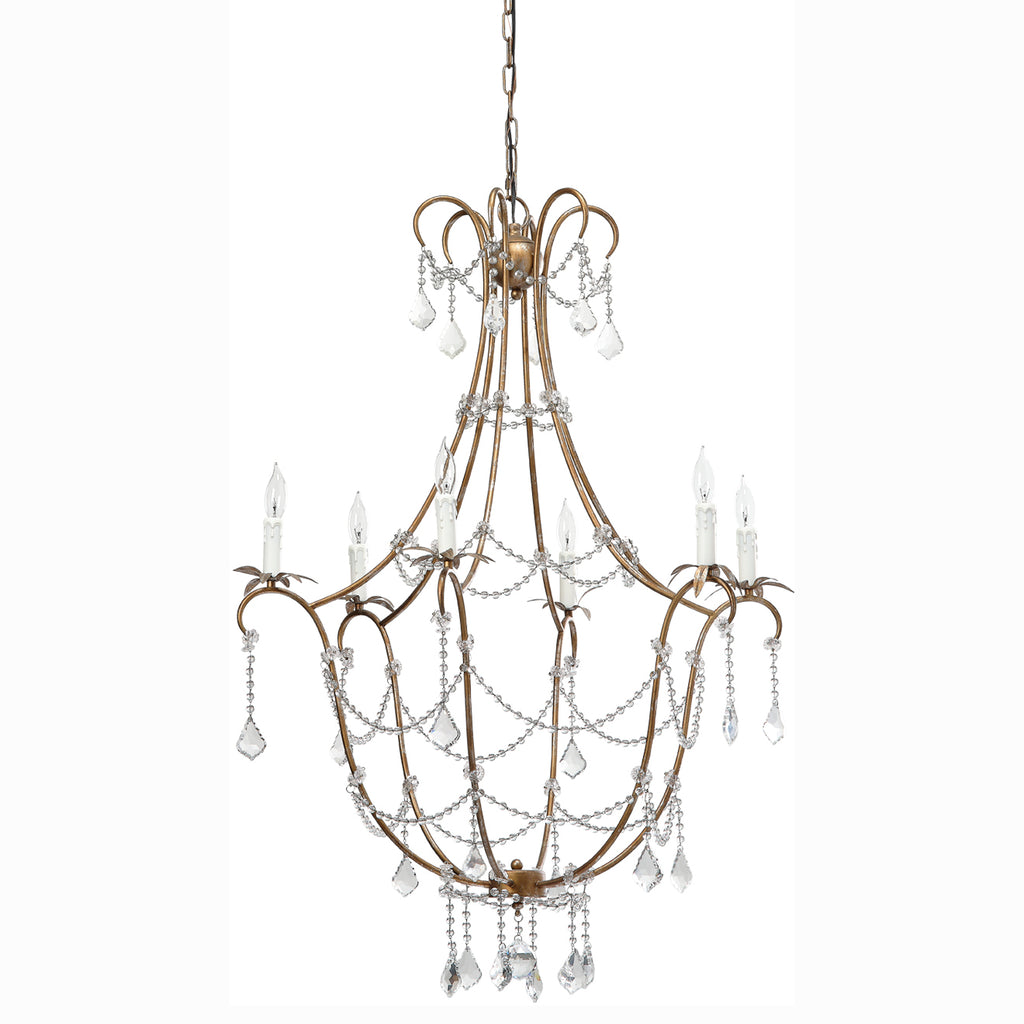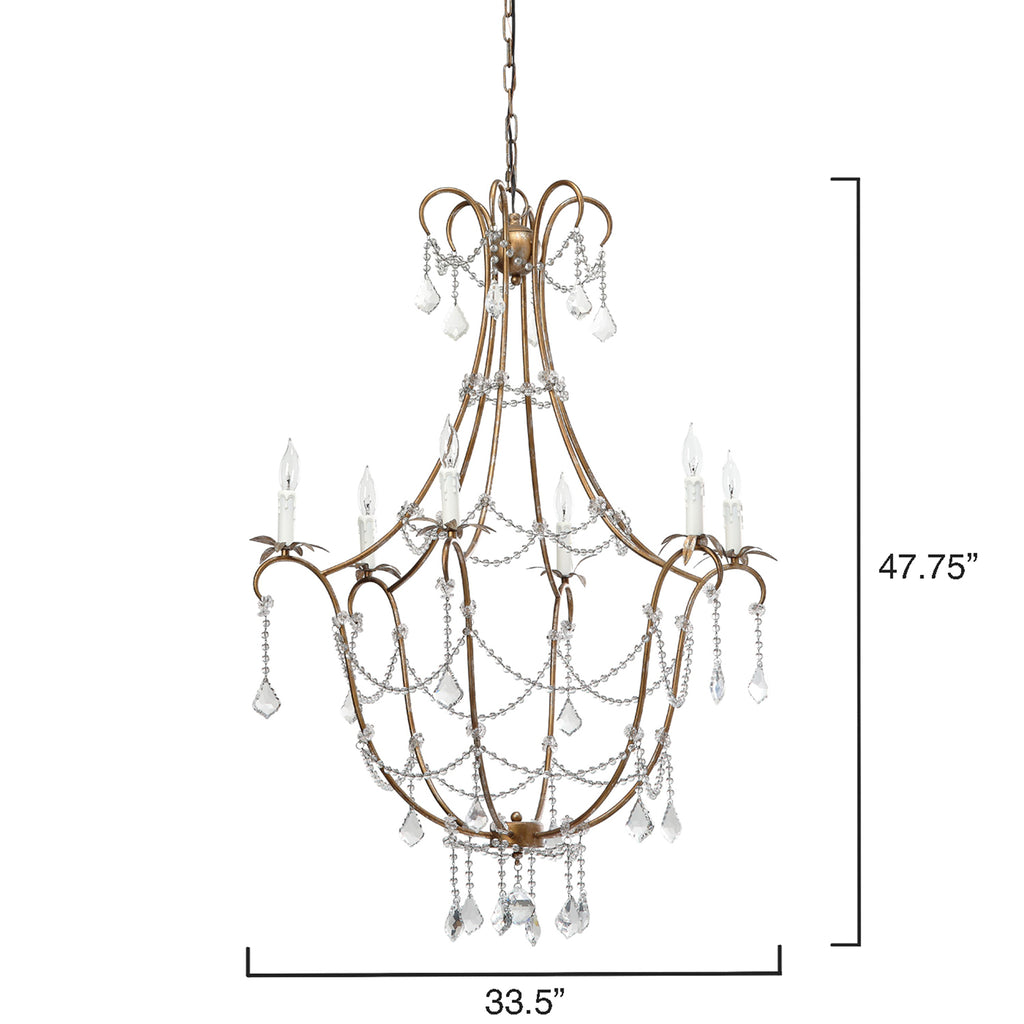 This large chandelier screams glamorous from the tip of the champagne ironwork to the ends of the cut crystal jewels dripping below. Chains of crystal beading are woven and draped among the scrolling structure and include over twenty dangling crystal jewels. Six faux dripping candles are perched in iron blooms, giving this fixture a subtle botanical touch. This chandelier will bring a touch of delicate drama to your dining room, bedroom, or entryway. The fixture is suspended from a coordinating 8-foot chain in champagne, and professional installation is recommended.
