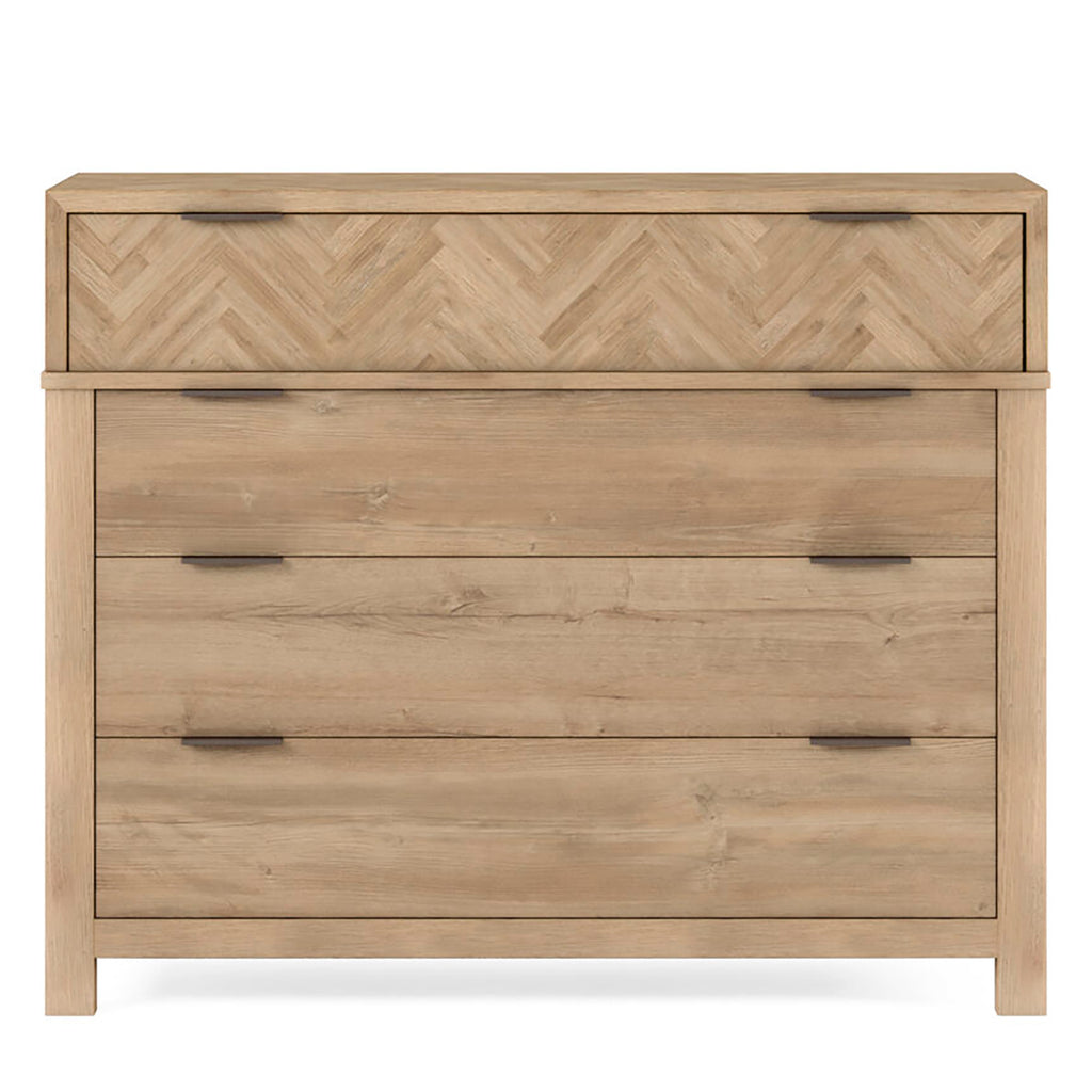 This versatile Accent Chest is a perfect solution for small spaces - acting as a compact version of our A.R.T. Furniture Garrison Dresser, or for larger rooms - used as an oversized nightstand. Either way, this chest packs storage and style into a workable footprint. Its warm, Washed Oak finish, herringbone veneer detailing and subtle burnished brass hardware harmoniously combine to create timeless beauty for the home.