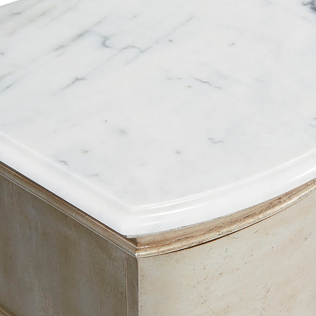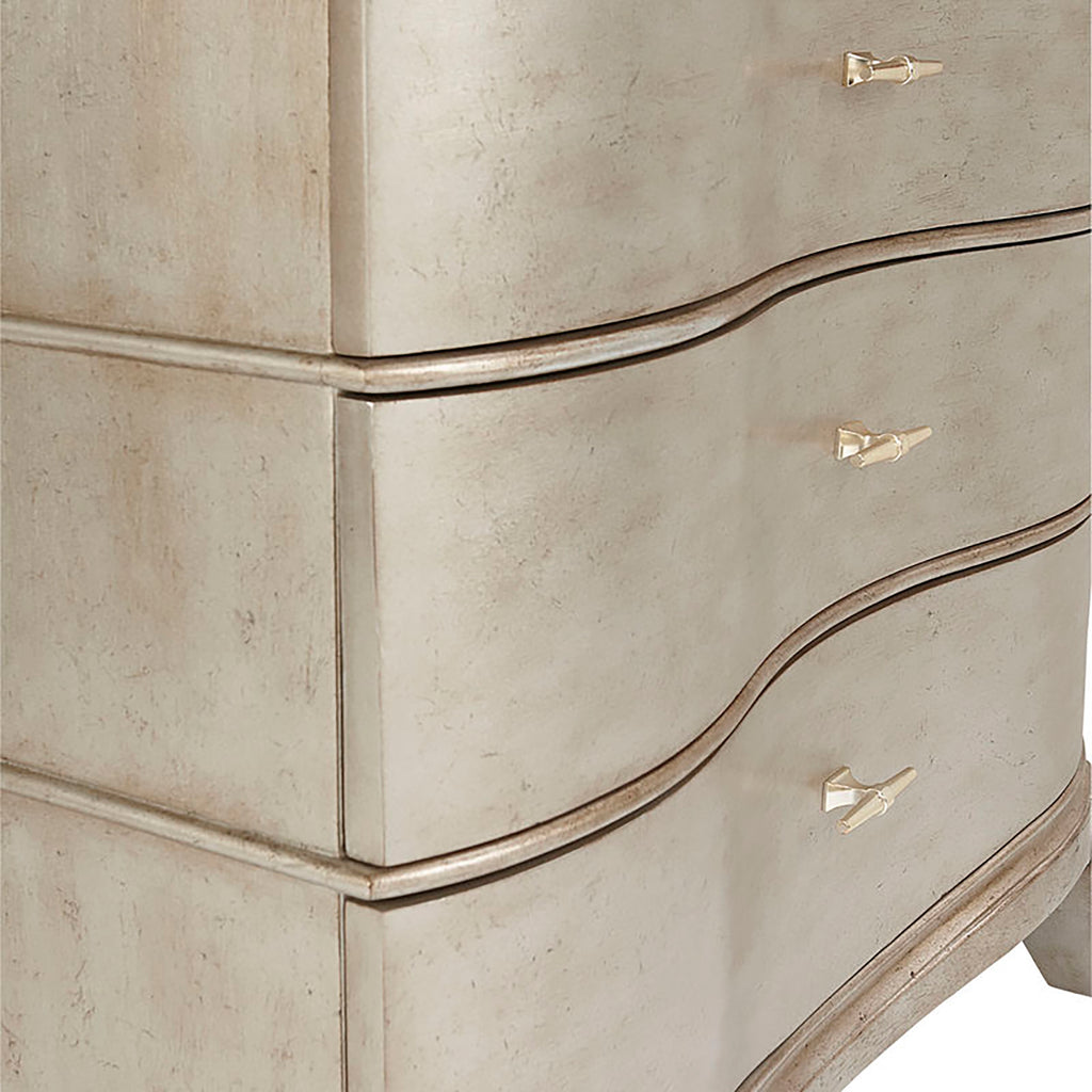 The handsome A.R.T. Furniture Starlite Bachelor Chest has three roomy drawers set into a gently curved serpentine front. The top of the chest is highly figurative polished stone; the body is finished with silver Bezel paint that has been glazed and gently aged for a soft sheen.