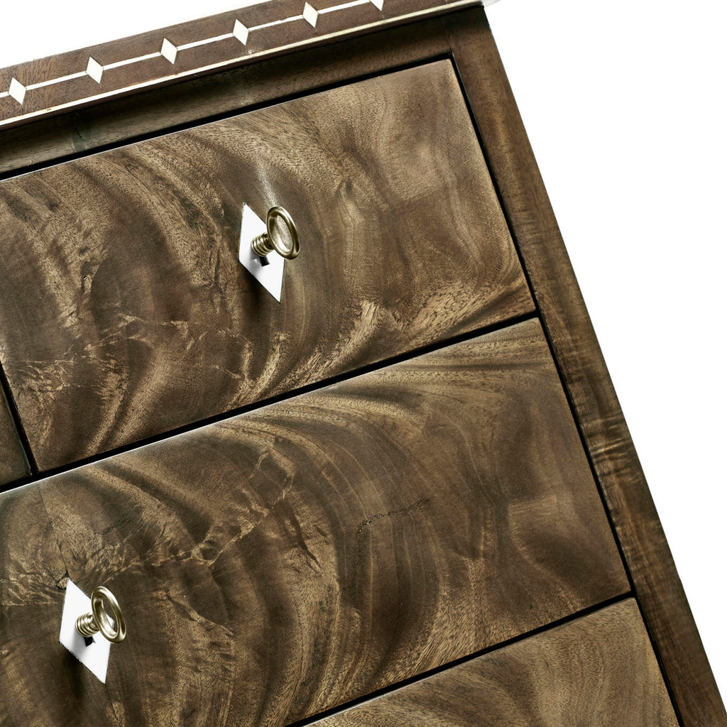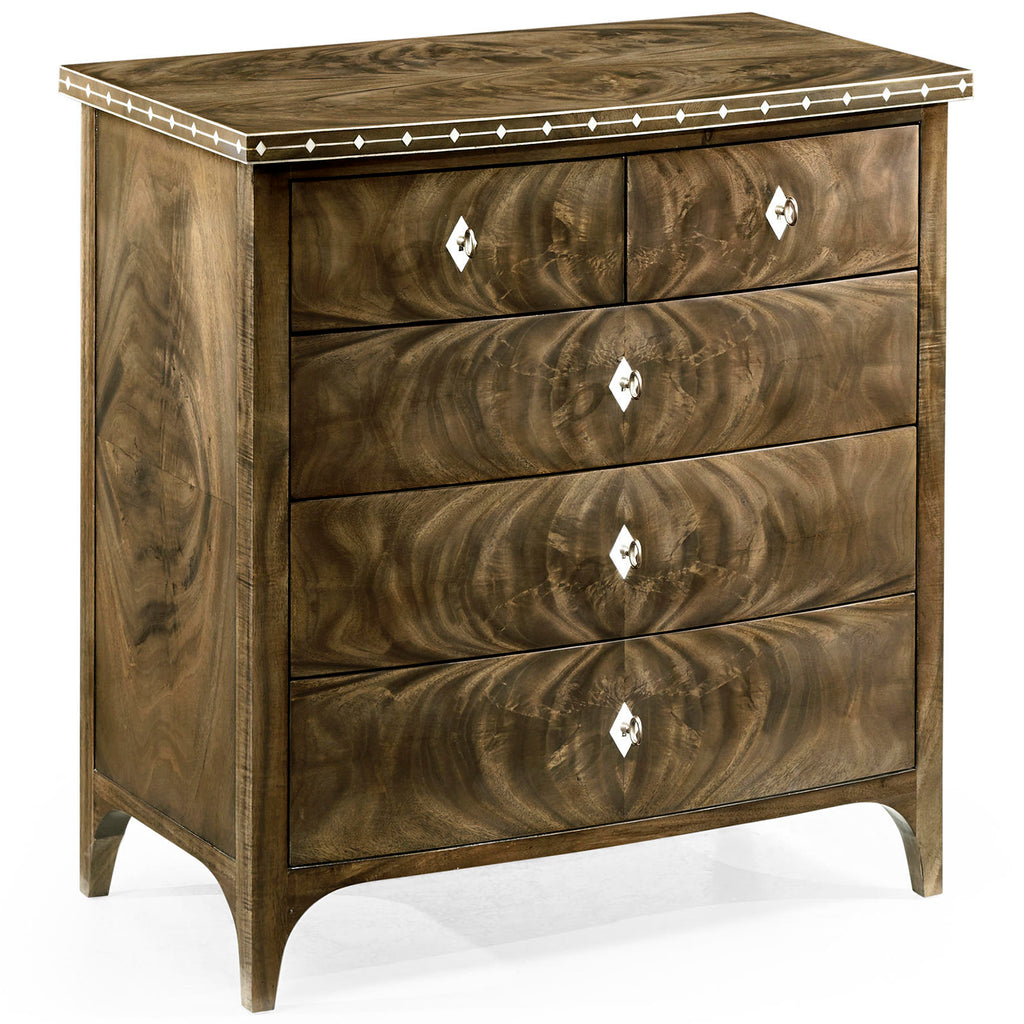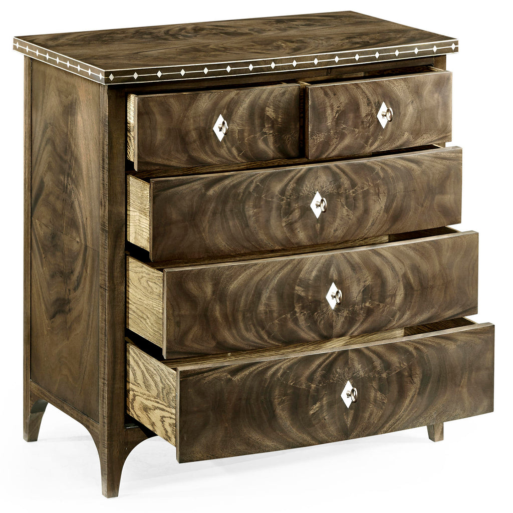 Classically styled bleached mahogany bedroom chest with hand cast brass hardware and bone inlay on top.