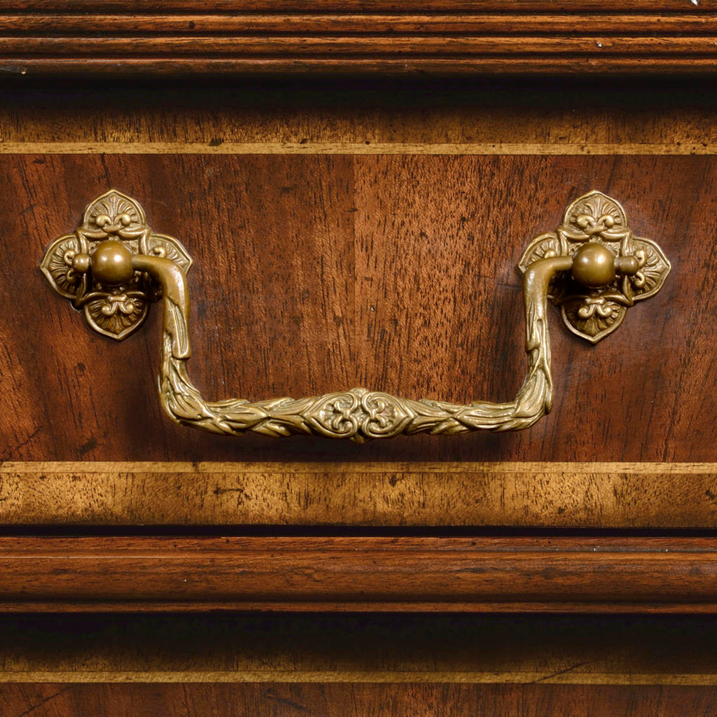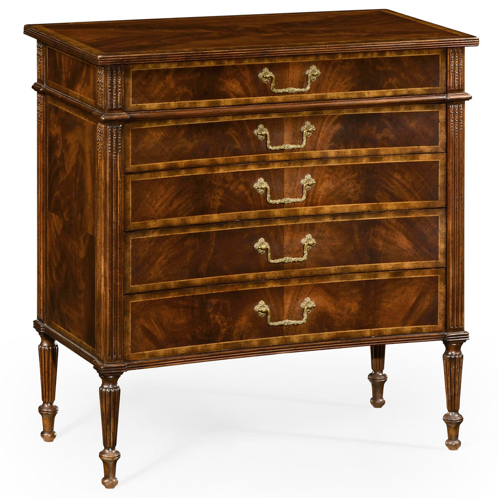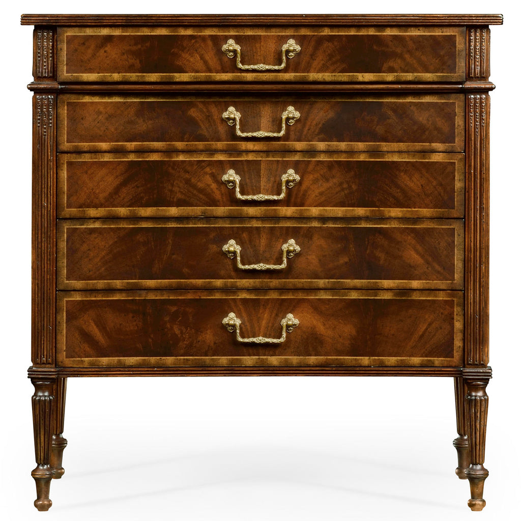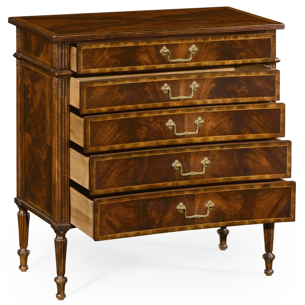 Napoleon III style mahogany veneered and crossbanded chest of drawers with a concave profile, the reeded top above five graduated drawers raised on fluted legs. The top drawer with phone and MP3 charger within.