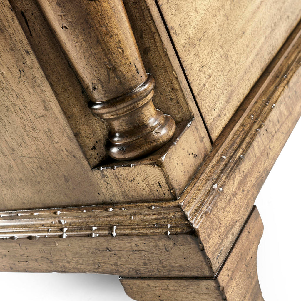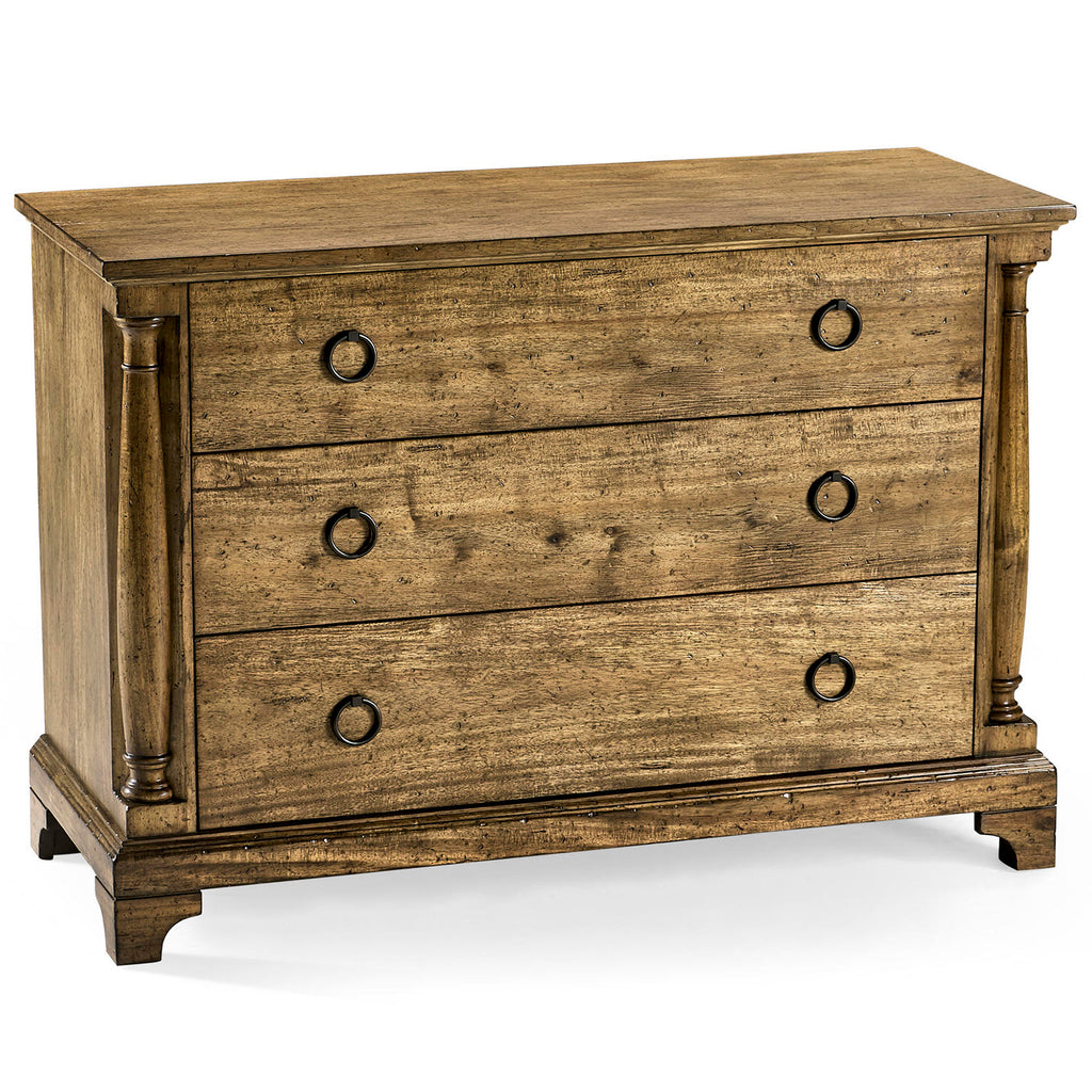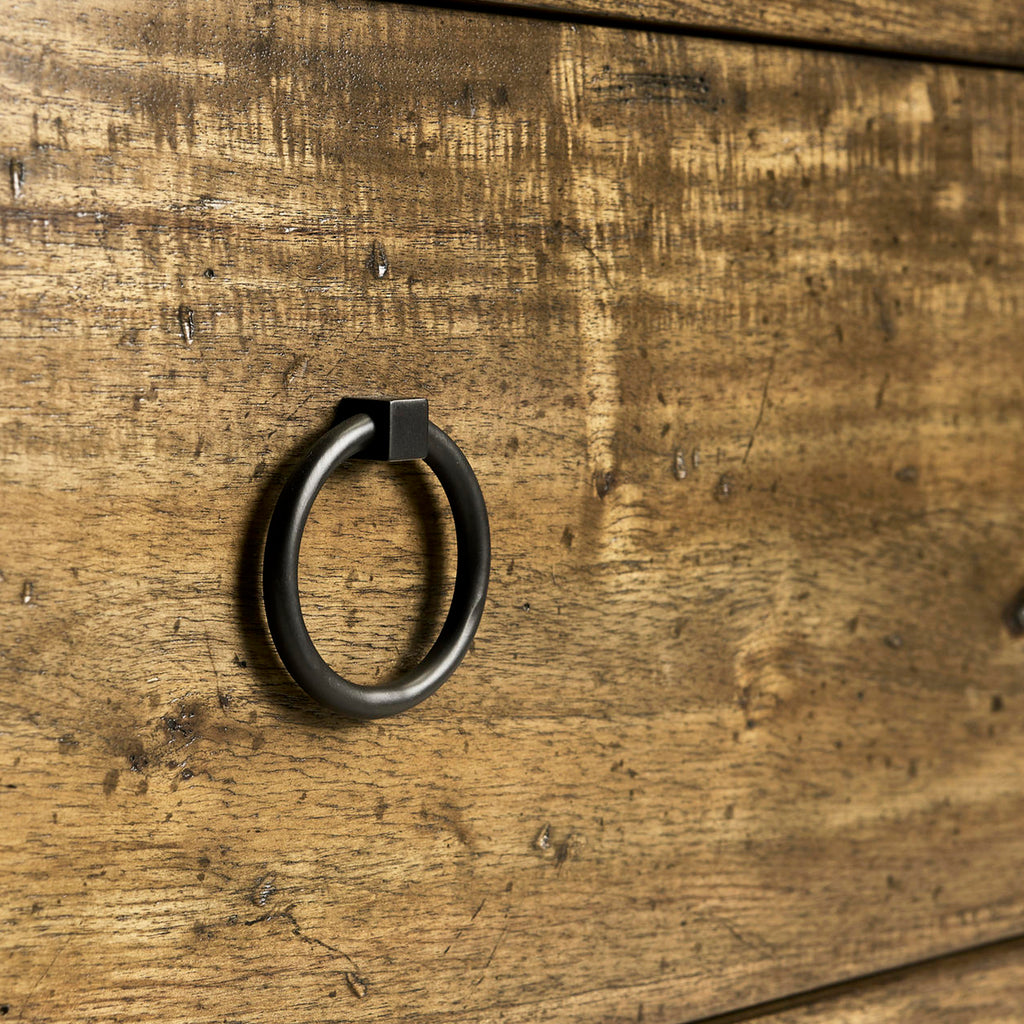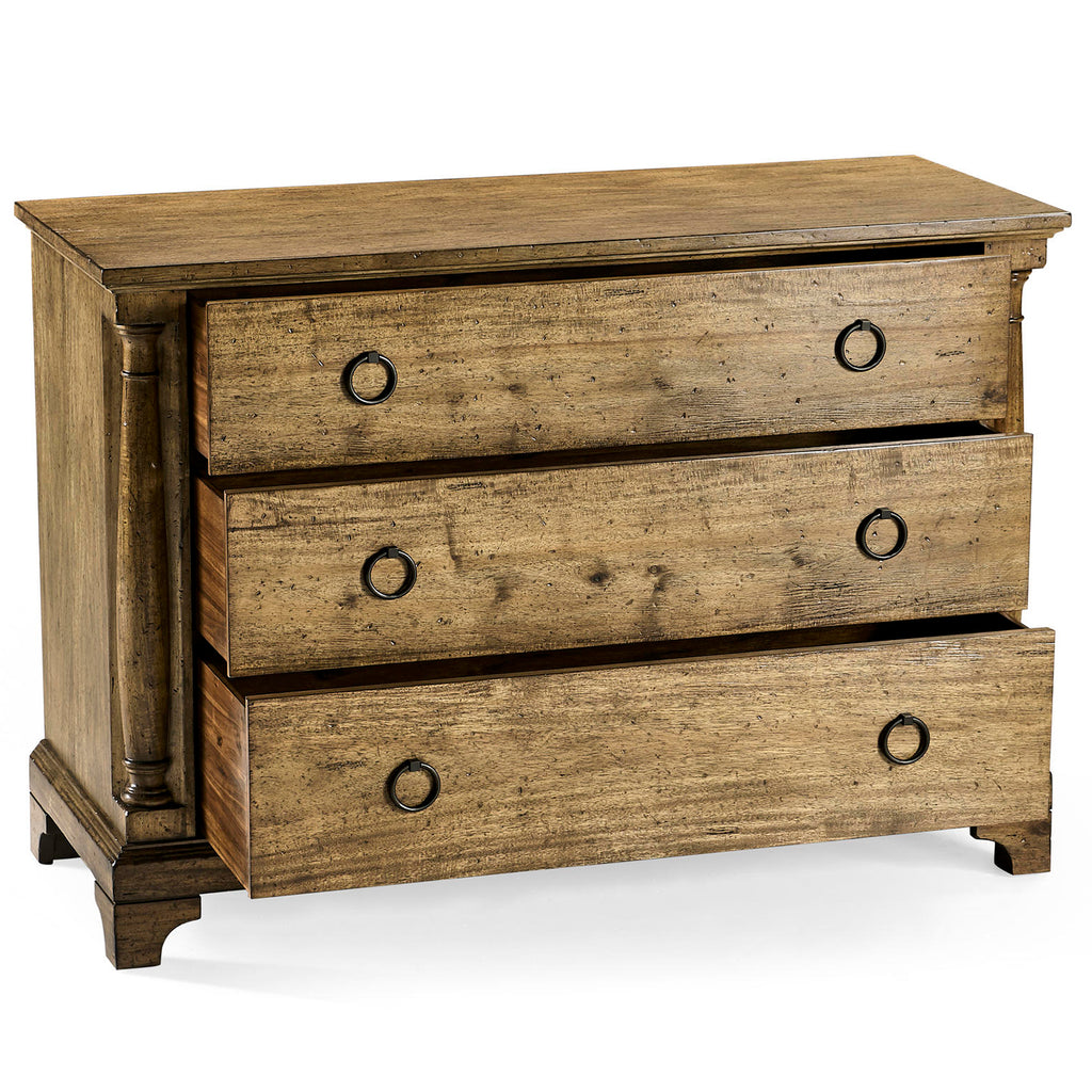 Medium driftwood chest of drawers on a stepped pedestal base with brass ring handles.