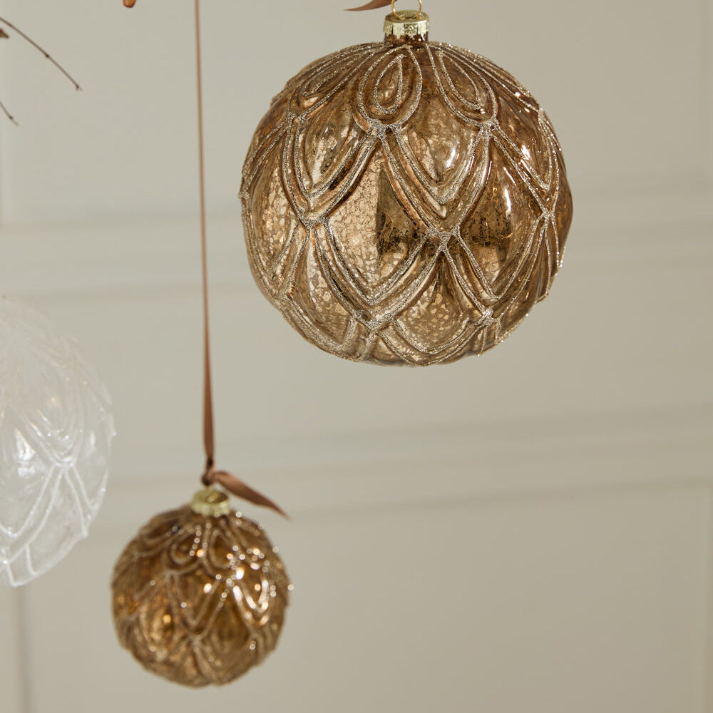 Sparkling scalloped lines trim the warm brown base of the Adriatic Ornament, a beautiful glass sphere with dimensional details and a brilliant glow. Trimmed in thin lines of glitter and capped with a small gold top and string, both lightweight sizes of the Adriatic bring stunning style to the Christmas tree.