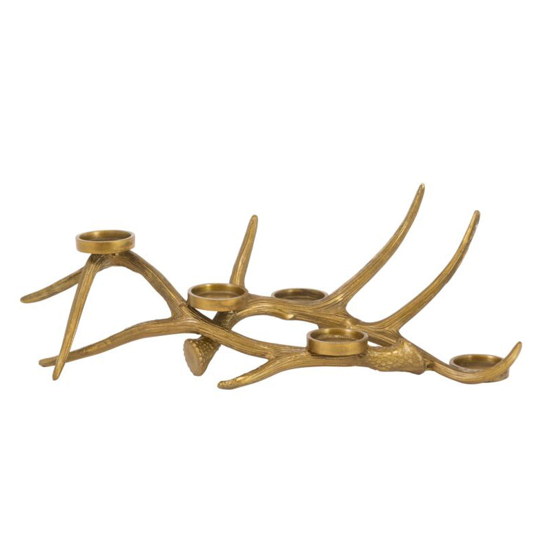 Bring a wintry forest glow indoors with the Andean Antler Candleholder, a recycled cast aluminum pillar holder designed to illuminate a non-functional fireplace, or be styled on a tabletop. Artfully arranged antlers hold five circular platforms that can be styled with 3-inch diameter pillar candles. Layer as a centerpiece to bring a stately, nature-inspired focus to the holiday table.