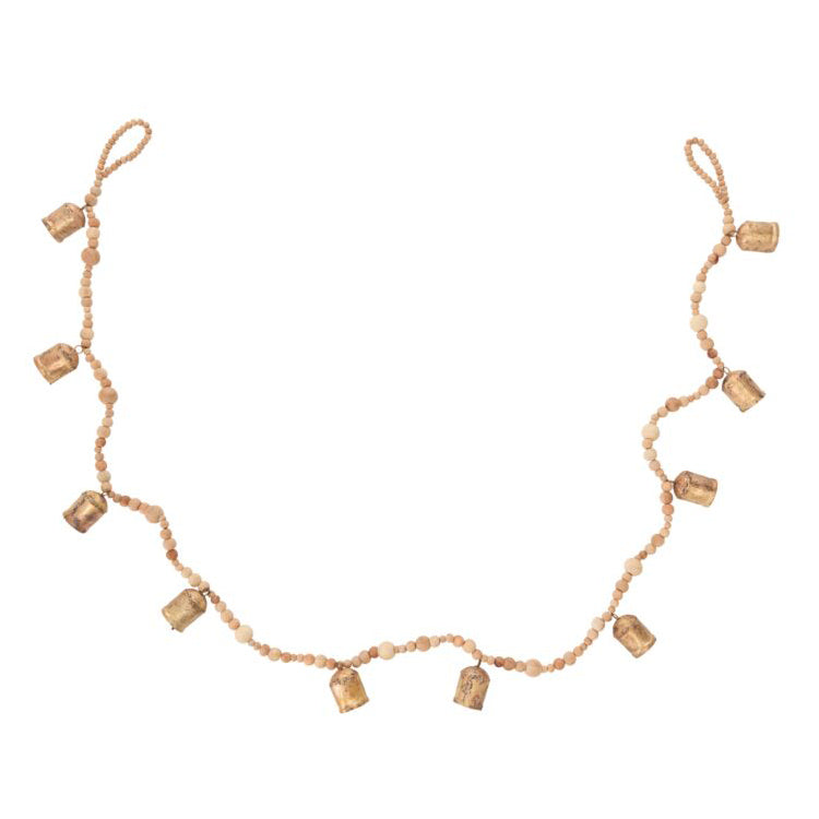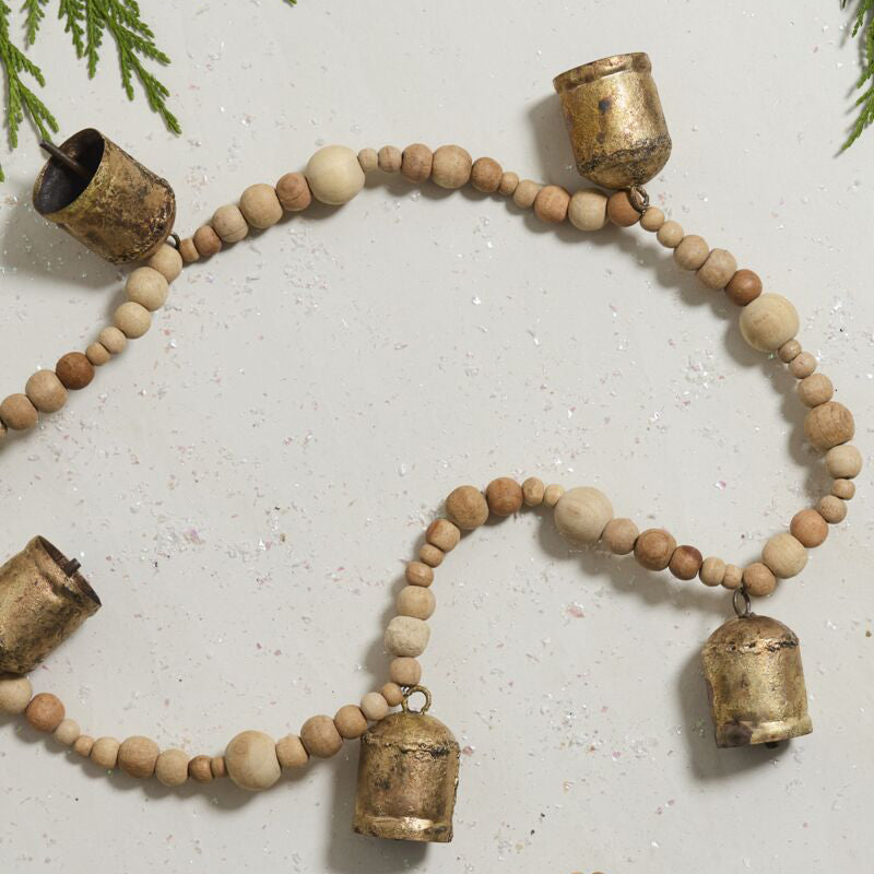 Simple wooden beads separate vintage inspired bells on the Bead and Bell Garland, a neutral and festive style that can layer in with any vibe of holiday decor. The light tone of the mango wood beads is versatile and the bells have an antique gold finish that adds a little shine to a mantle, especially when layered in with fresh greenery.