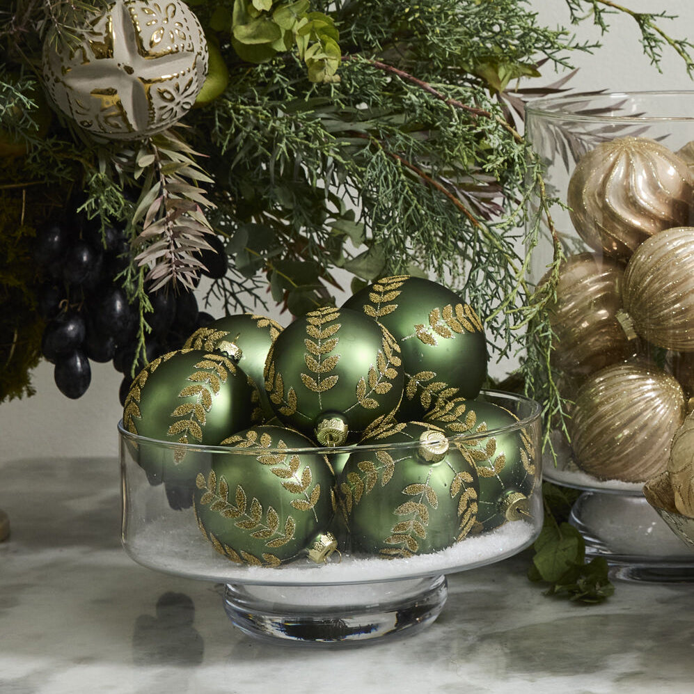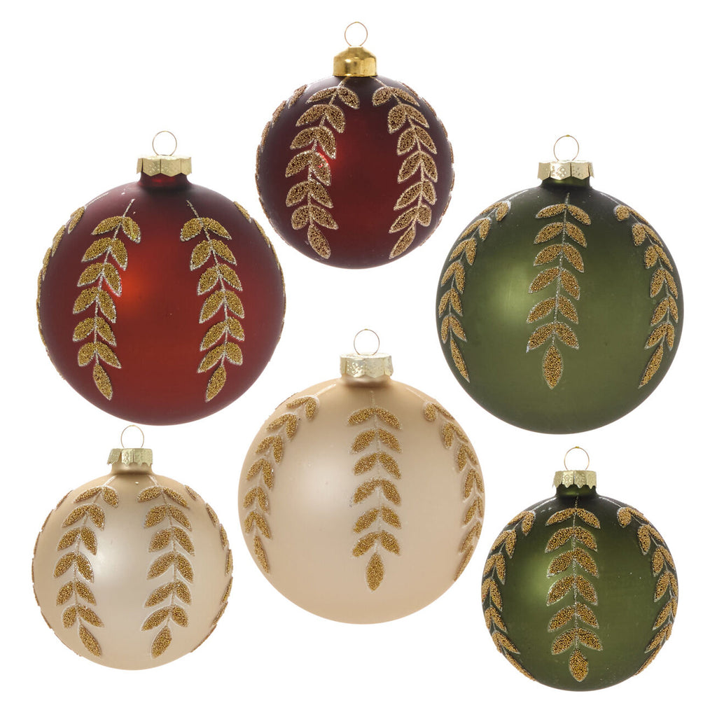 Simple spheres are made shiny and special with tiny glimmering beads on the Beaded Leaf Ornament. The super smooth, matte glass base of each style in this collection looks stunning against the delicate, gold leaf pattern that spans from top to bottom of each globe. In a warm burgundy hue and two versatile sizes, the Beaded Leaf collection is timeless for decorating an elegant Christmas tree.
