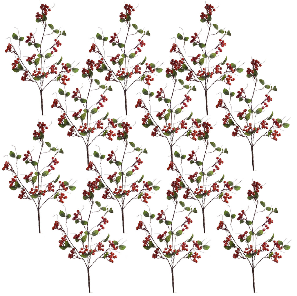 Add a touch of nature to your home decor with this beautiful set of Boxwood Twig Sprays. Featuring twelve pieces, this set would be a great addition to your everyday or Christmas floral vases or arrangements. The bright red berries paired with the faux twig spray is the perfect combination to create a stunning spring display. The quality polyester and foam components are sure to last for seasons to come. Display the pieces in a set of vases or wall baskets to complete the look.