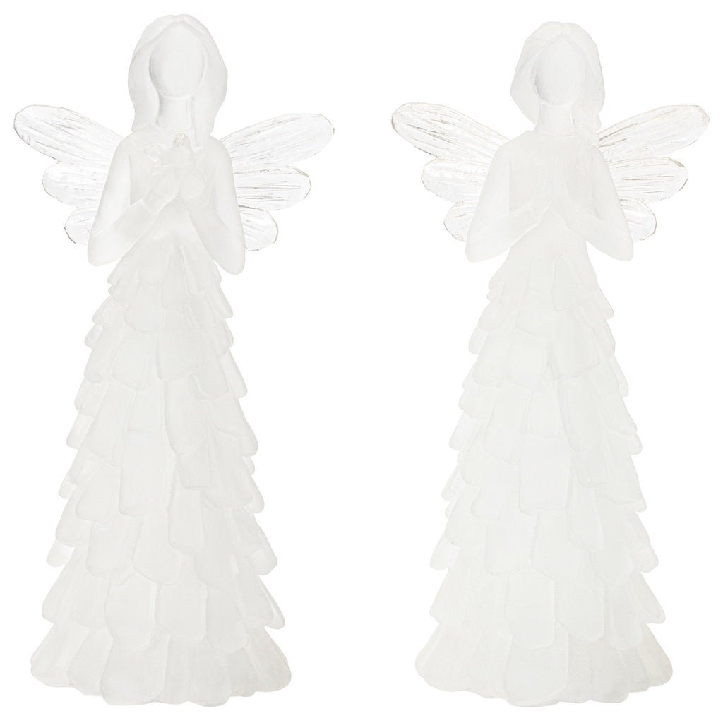Bring serenity into your home this spring season with a stunning set of Angel Figurines. Featuring four pieces with two assorted designs, this set is a great fit for your country cottage or garden chic style of decor. The cool white tones paired with the chic frosted finish are perfect to create a memorable display. The quality polyresin composition is sure to endure for seasons to come. Display the pieces on a covered porch or patio, or arrange them alongside your indoor floral arrangements to make a statement in your home!