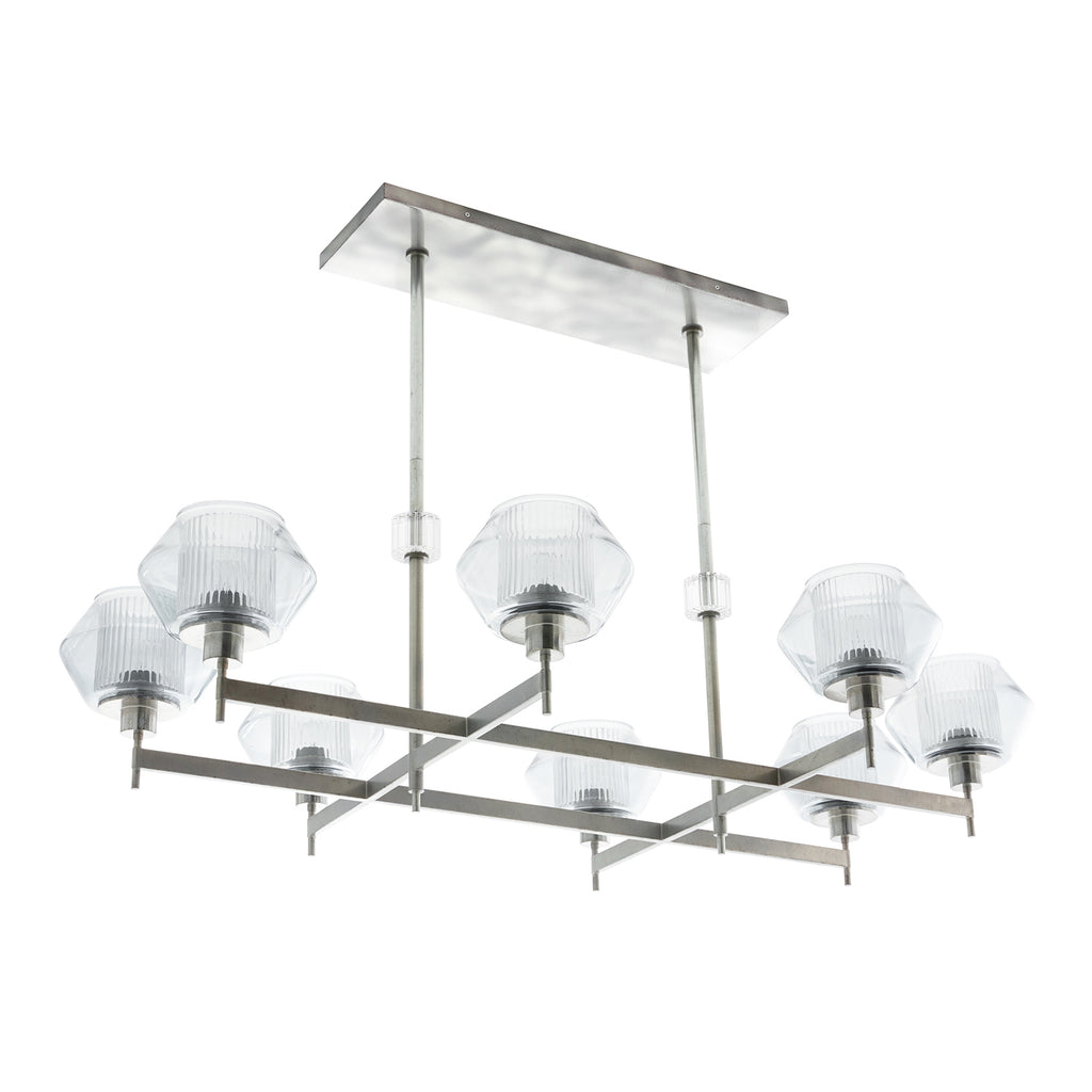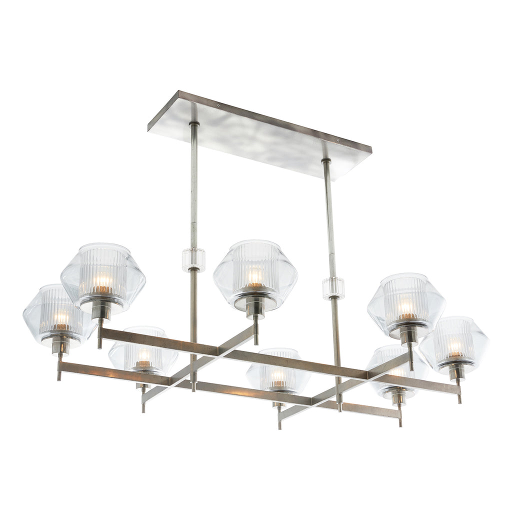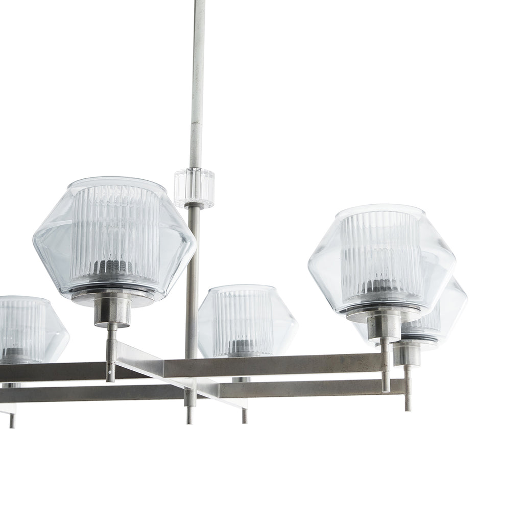 Arteriors Home lighting embodies the perfect balance of form and function, creating an ambiance that is both captivating and inviting. With an emphasis on superior craftsmanship, Arteriors ensures that their chandeliers not only illuminate the room but also make a statement. Both elegant and strong, this rectilinear chandelier is reminiscent of Italian Master Carl Fagurland. The pewter finish delicately holds the shades of two glass layers creating playful shadows of light. The clear ribbed interior glass mixed with the blue smoke outter glass create beautiful diffused light.