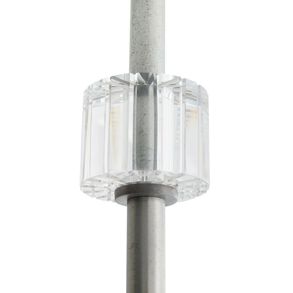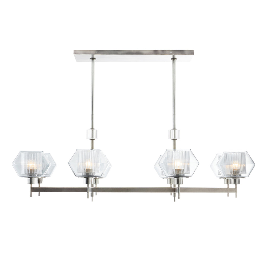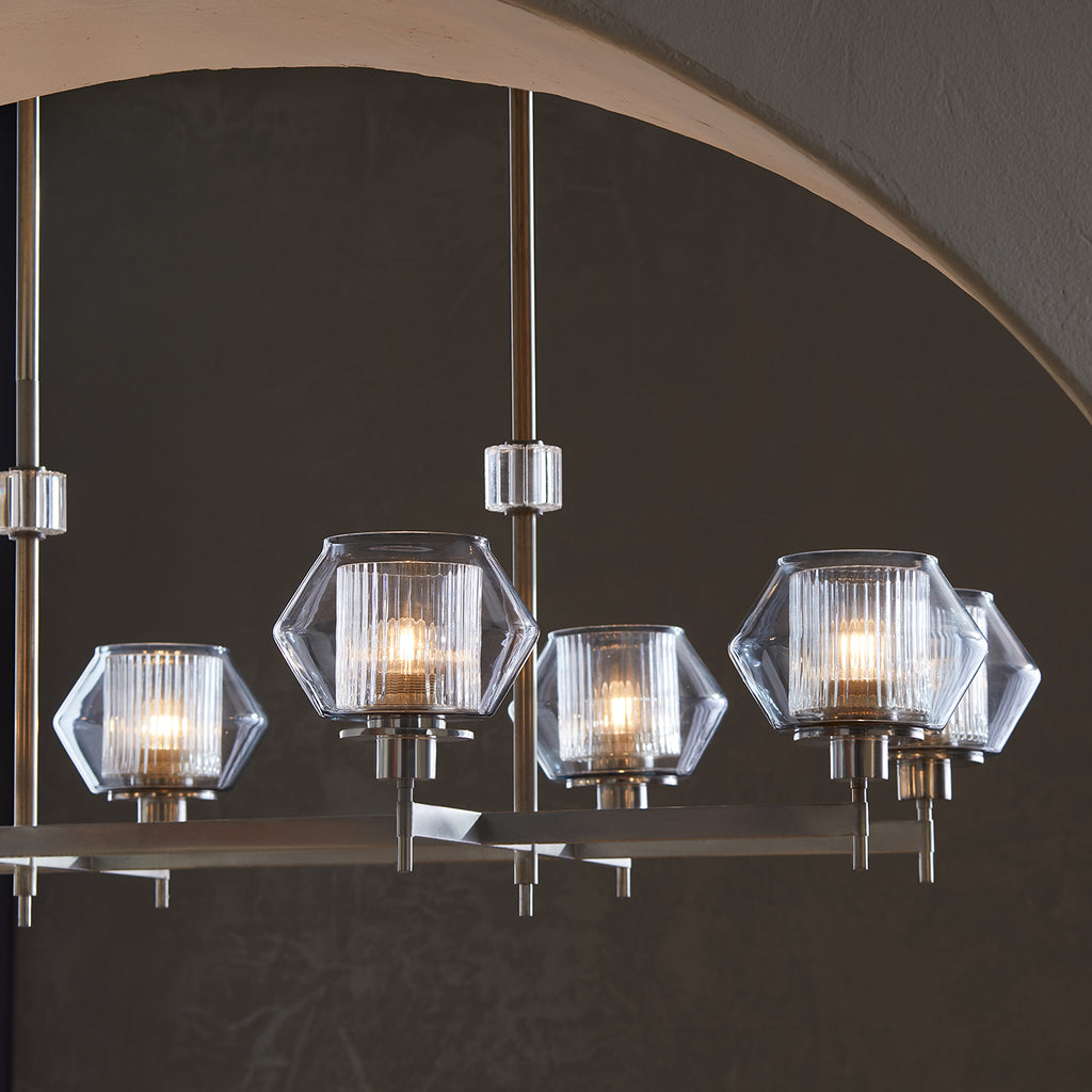Arteriors Home lighting embodies the perfect balance of form and function, creating an ambiance that is both captivating and inviting. With an emphasis on superior craftsmanship, Arteriors ensures that their chandeliers not only illuminate the room but also make a statement. Both elegant and strong, this rectilinear chandelier is reminiscent of Italian Master Carl Fagurland. The pewter finish delicately holds the shades of two glass layers creating playful shadows of light. The clear ribbed interior glass mixed with the blue smoke outter glass create beautiful diffused light.