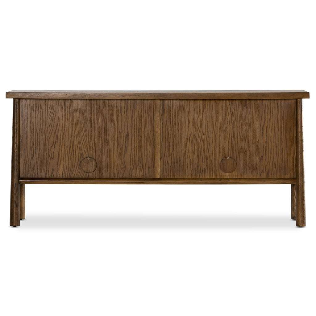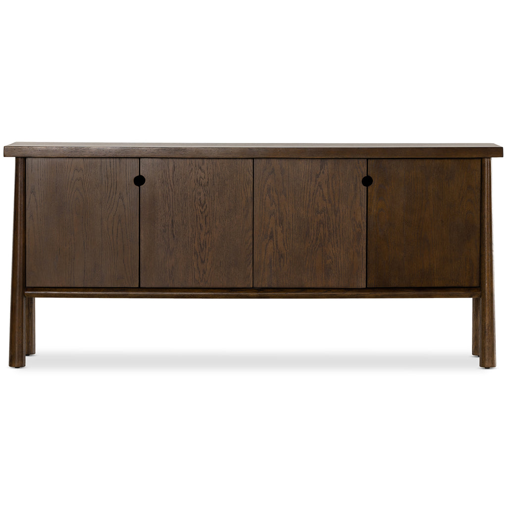 Dark-toasted solid oak forms a beautifully simple sideboard, with round cutouts in place of hardware for a fun finishing touch.