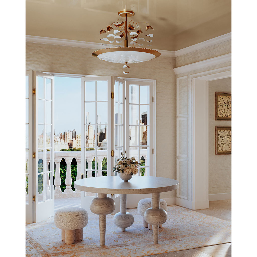 Renowned for built-to-last quality with a timeless feel, Hudson Valley offers a modern lighting collection with elegant touches, recalling vintage inspiration. Marked by symmetry and high-drama to marvel at from below, Hudson Valley Lighting chandeliers illuminate your living or dining room with inviting warmth. A nod to Finnish designer, Paavo Tynell, Paavo is like artwork suspended from the ceiling. Delicate discs of soft-white plaster and gold leaf cascade above an opal glossy shade surrounded by more gold leaf. Two additional discs hang below the finial adding even more visual interest. Light fills the underside of the floating discs and casts a beautiful golden glow.