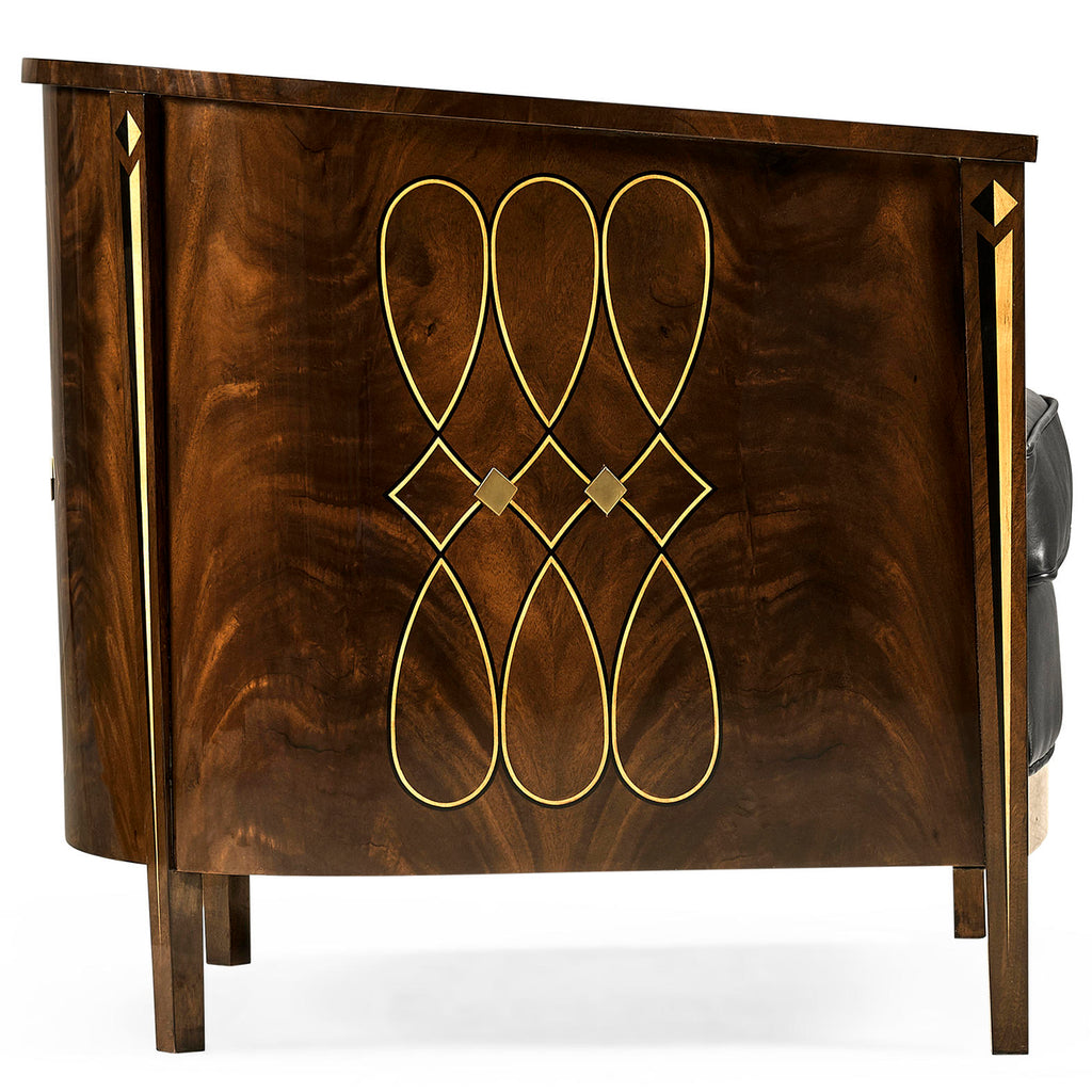 Biedermeier style brown mahogany tub chair, fully black leather upholstered with geometric pattern inlay design to the sides and back. Inspired by European designs of the early 20th century.