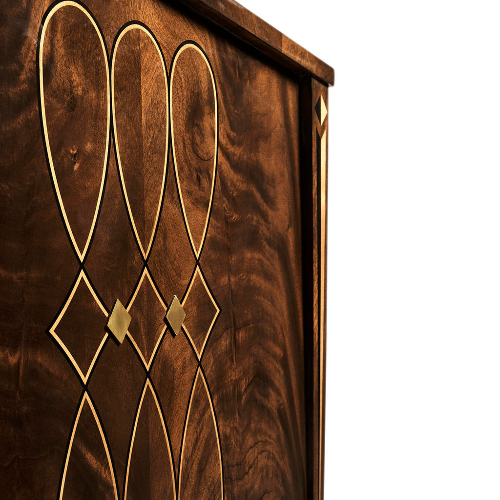 • Outside back and arms features a geometric inlay pattern with brass accents
