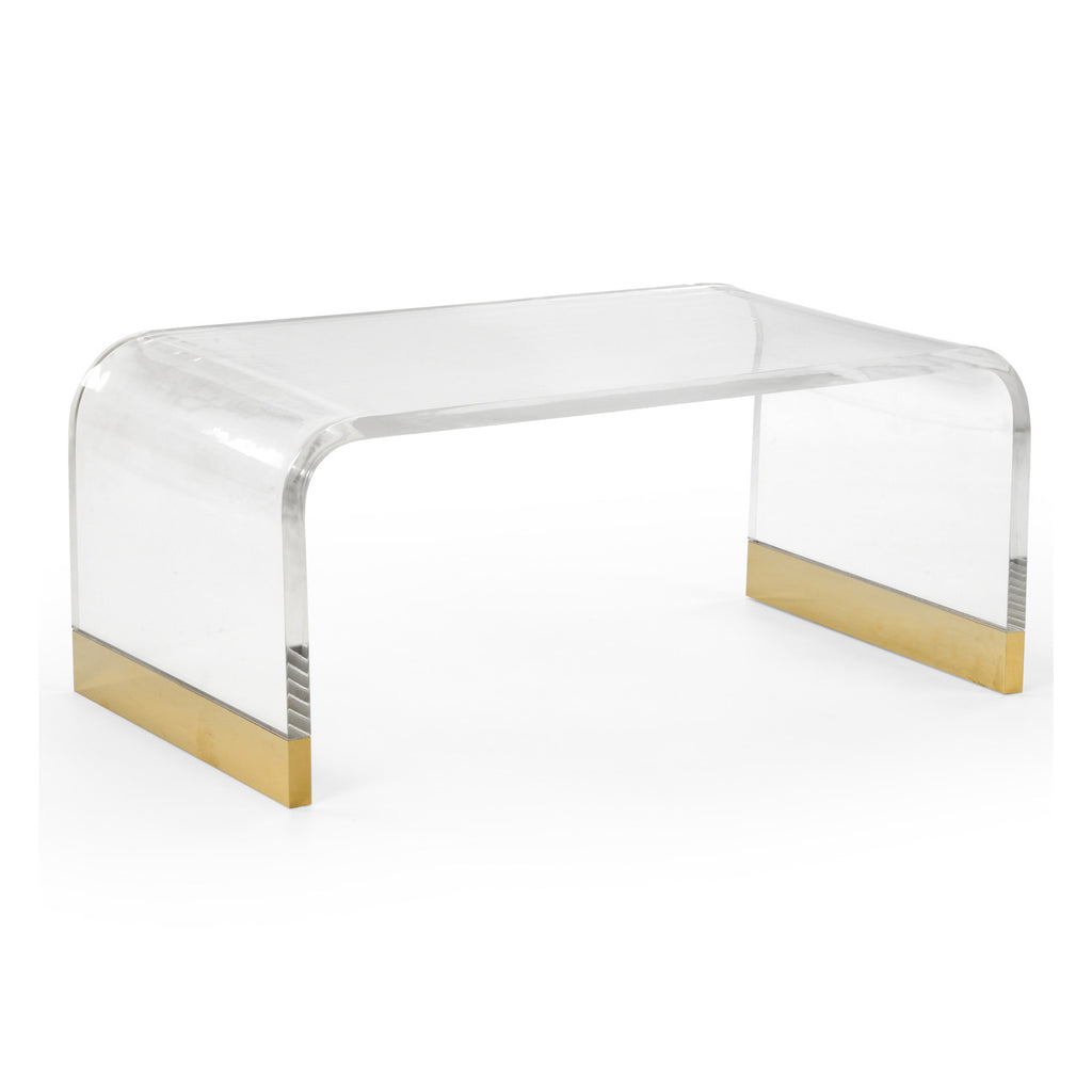 Anchor your room living room with the style of the contemporary Acrylic Waterfall Chelsea House coffee table. Its clean lines offer versatility to match a variety of styles for a bold statement. Clear Acrylic With Antique Brass Feet.
