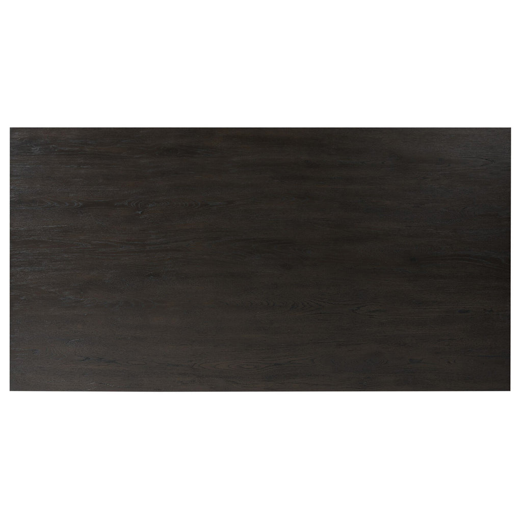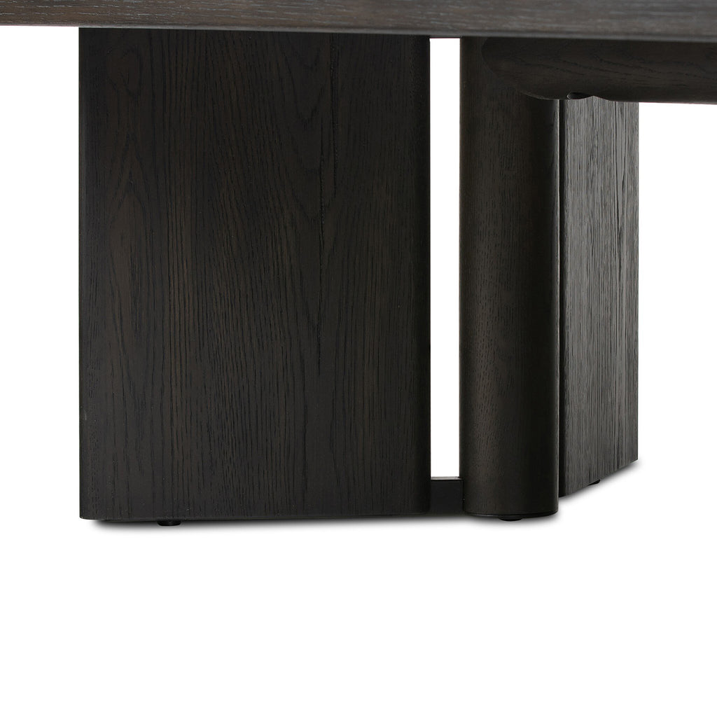 A smoked black or rubbed light oak finish delivers a character-rich look to a rectangular coffee table. Angled panel legs up the intrigue factor.