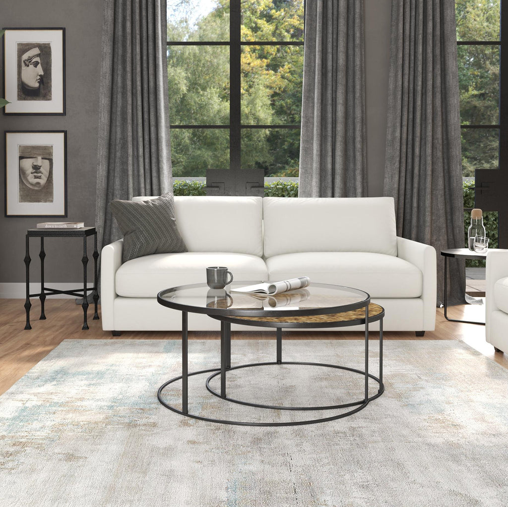 Sleek meets organic with the Chatham Nesting Cocktail Tables, featuring a glass-top larger table revealing a weave-patterned top in a natural wood multi-earth-toned finish on the smaller table below. An elliptical black metal frame ties the two tables together.