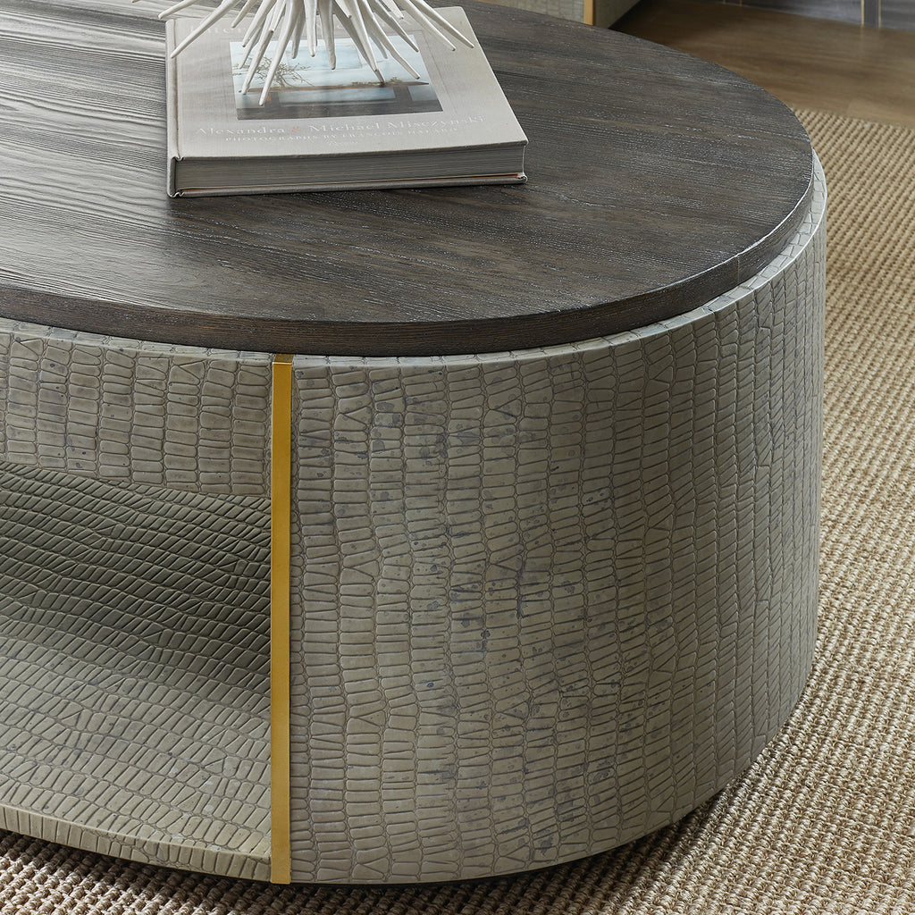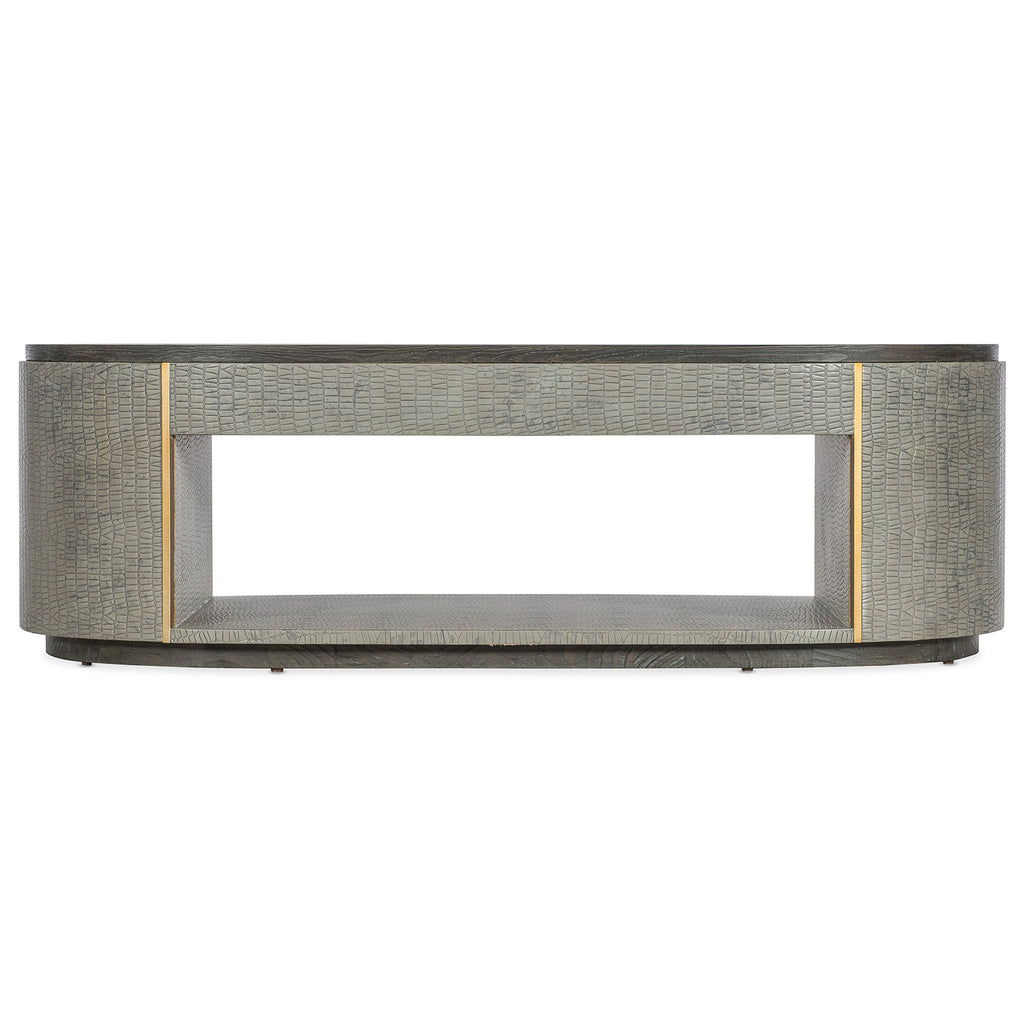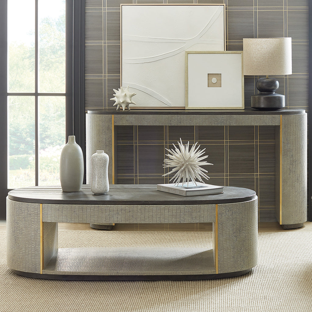 With the design flair of a luxurious fashion accessory, the Dylian Coffee Table has a gray crocodile exterior with gold metal accents and a dark wood top and base. Crafted of Pine Veneers and Robus Leather, it has an oval shape with an open shelf area.