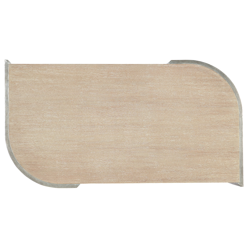 Offering a two-tone finish in a shaped design contrasting Oak Veneers in a light wood finish with a shimmery silver-finished base, the Silverfrost Cocktail Table has a calming contemporary style. One self-closing drawer with silver-finished bar pull.