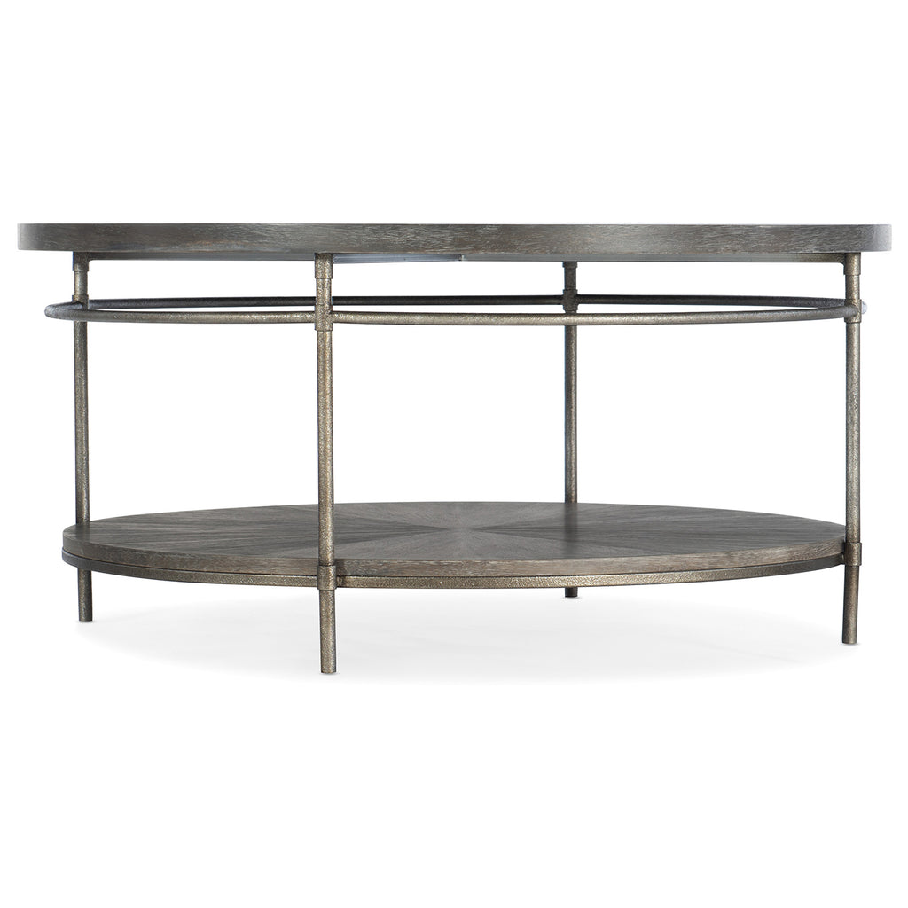 Beautifully scaled and intricately designed, this round cocktail table pairs a tabletop and bottom shelf crafted of Acacia Veneers with a starburst veneer pattern in a golden brown finish with a metal frame.