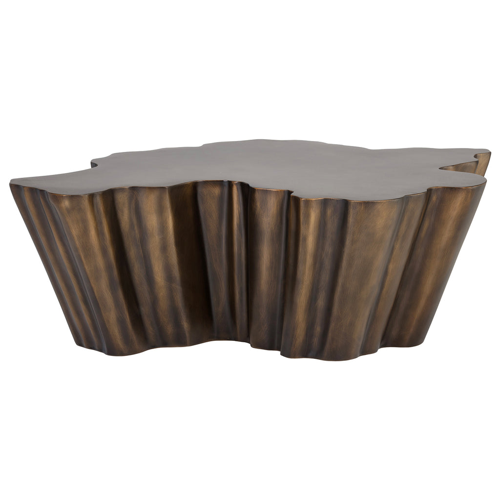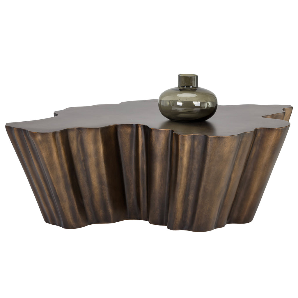 The Lynx Coffee Table features a uniquely organic shape for a bold and eye-catching design. Its sturdy base is crafted from a combination of wood and a polyurethane mould that support a steel tabletop. Each piece is then hand-painted with an antique bronze or antique gray powder-coated finish that resembles a refined, gently aged patina.