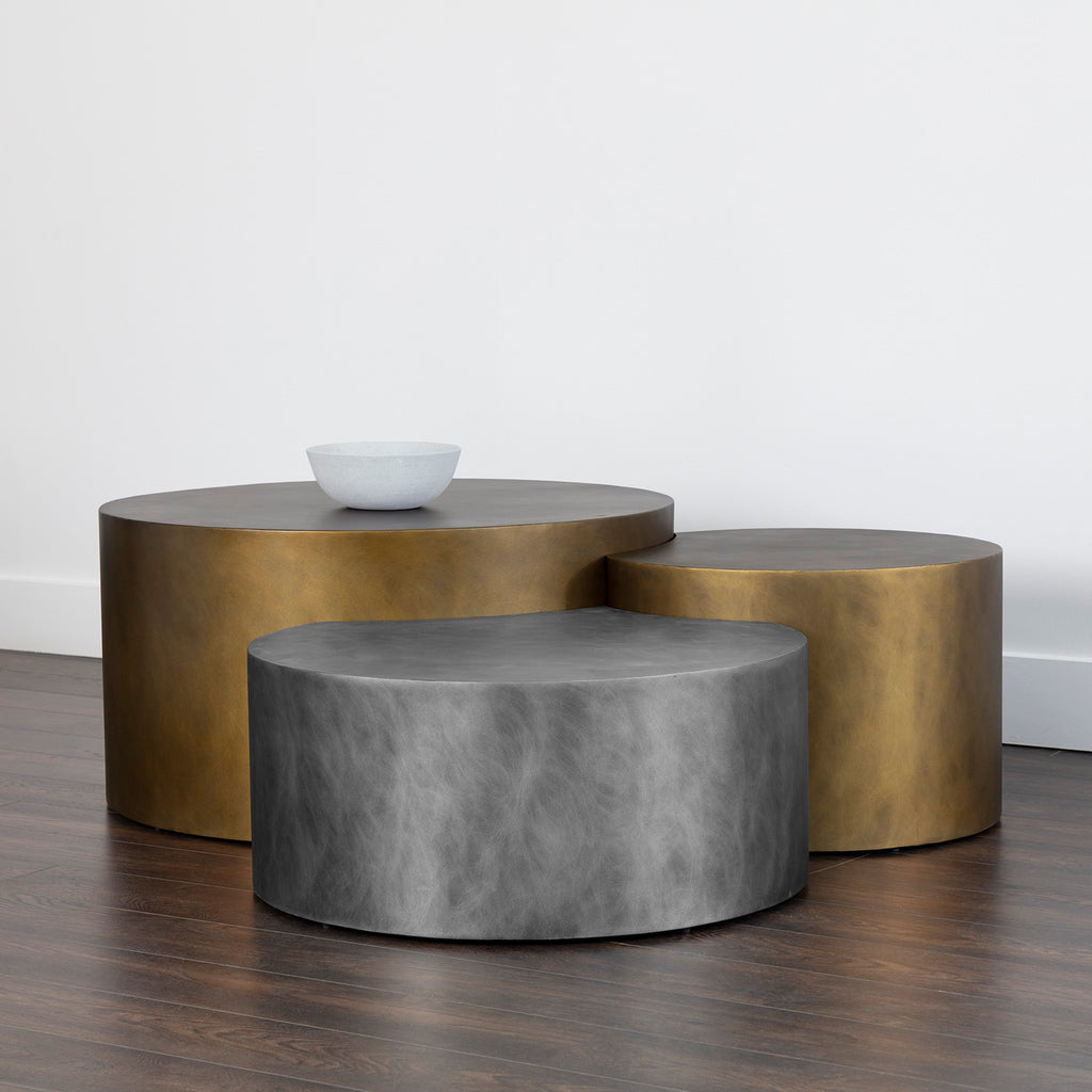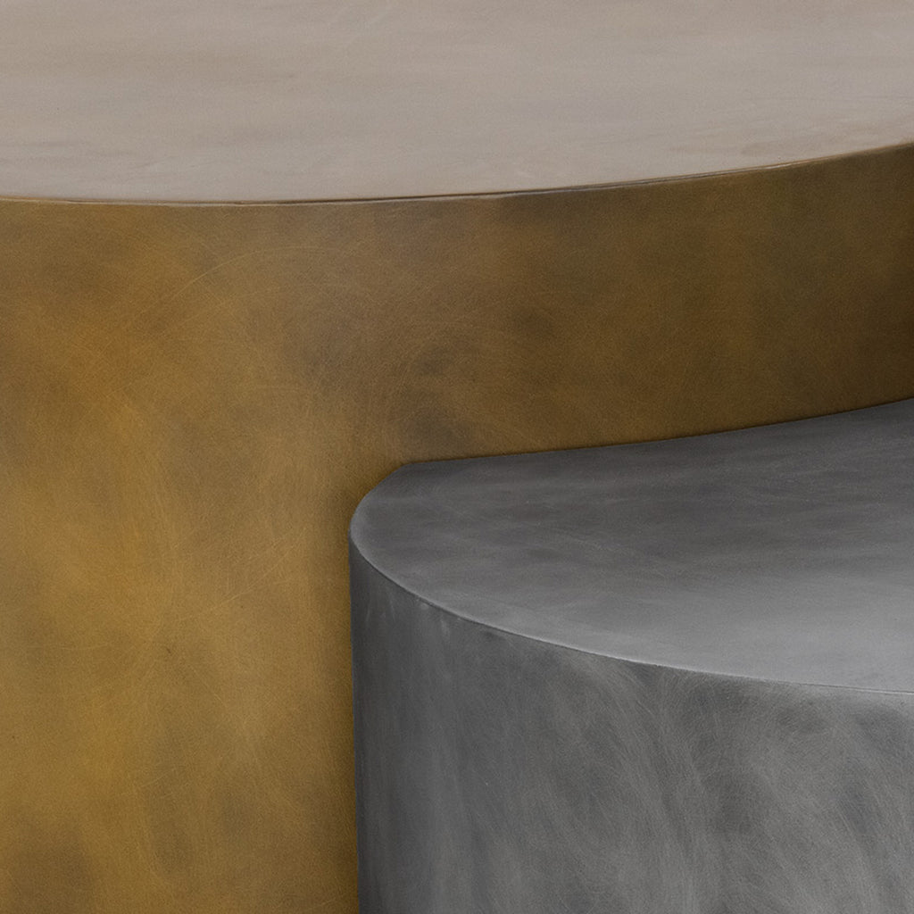 Add ultra contemporary appeal to various spaces with this stunning coffee table grouping. Comprised of three metal pieces designed to fit together at staggered heights and in varying antique brass and nickel finishes, for function and dimension at its finest. All three pieces sold as a set.