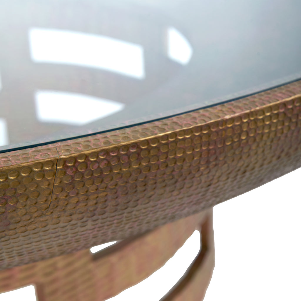 The Ella Coffee Table is a stunning piece which takes inspiration from a traditional Chinese design motif and combines it with a modern sense of space and texture. Peering through the tempered glass top to reveal the intricate hand-hammered fretwork base that gives this table its unique appeal. With a silhouette reminiscent of a symphonic tympani drum, the Ella is clad in antique brass for a sophisticated finish. The piece is a superb anchor for the design of your den or living room.