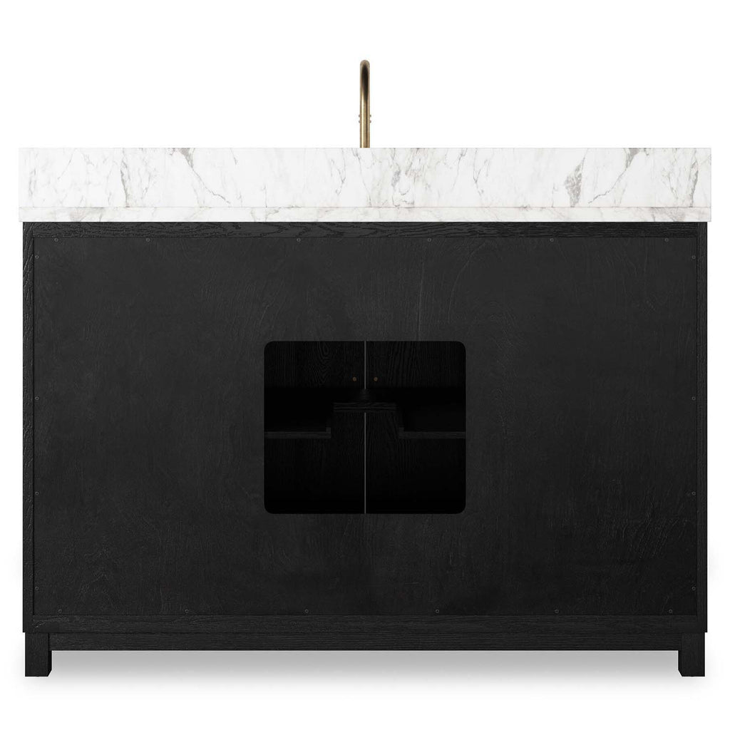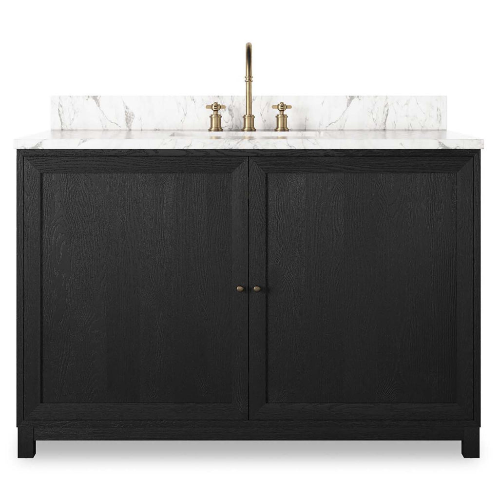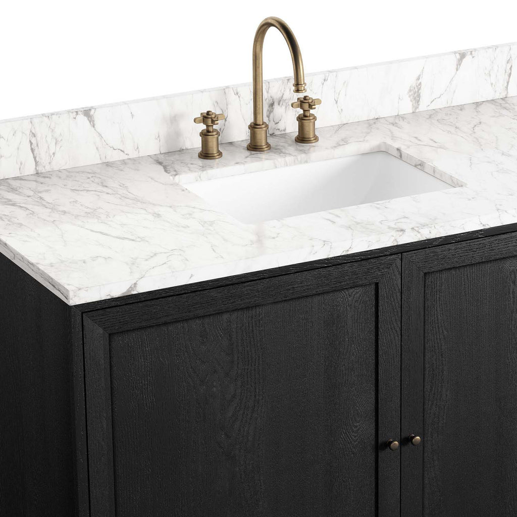 A sleek design built with tons of storage. Crafted with a thick oak veneer base in a satin black finish, a Carrera marble top and iron hardware in an antique bronze finish. A mix of drawers and cabinets offers plenty of storage. Drawers are fully finished in light natural oak; top drawer is not functional. Cabinets include removable shelves. Finished with a bath-safe sealant for moisture resistance. Designed to accommodate 8in-widespread faucets and standard-size hardware for easy customization; faucet shown not included. Sink and backsplash included; backsplash ships separately. Removable back with cutouts for plumbing; fits standard P-trap. Professional installation required.